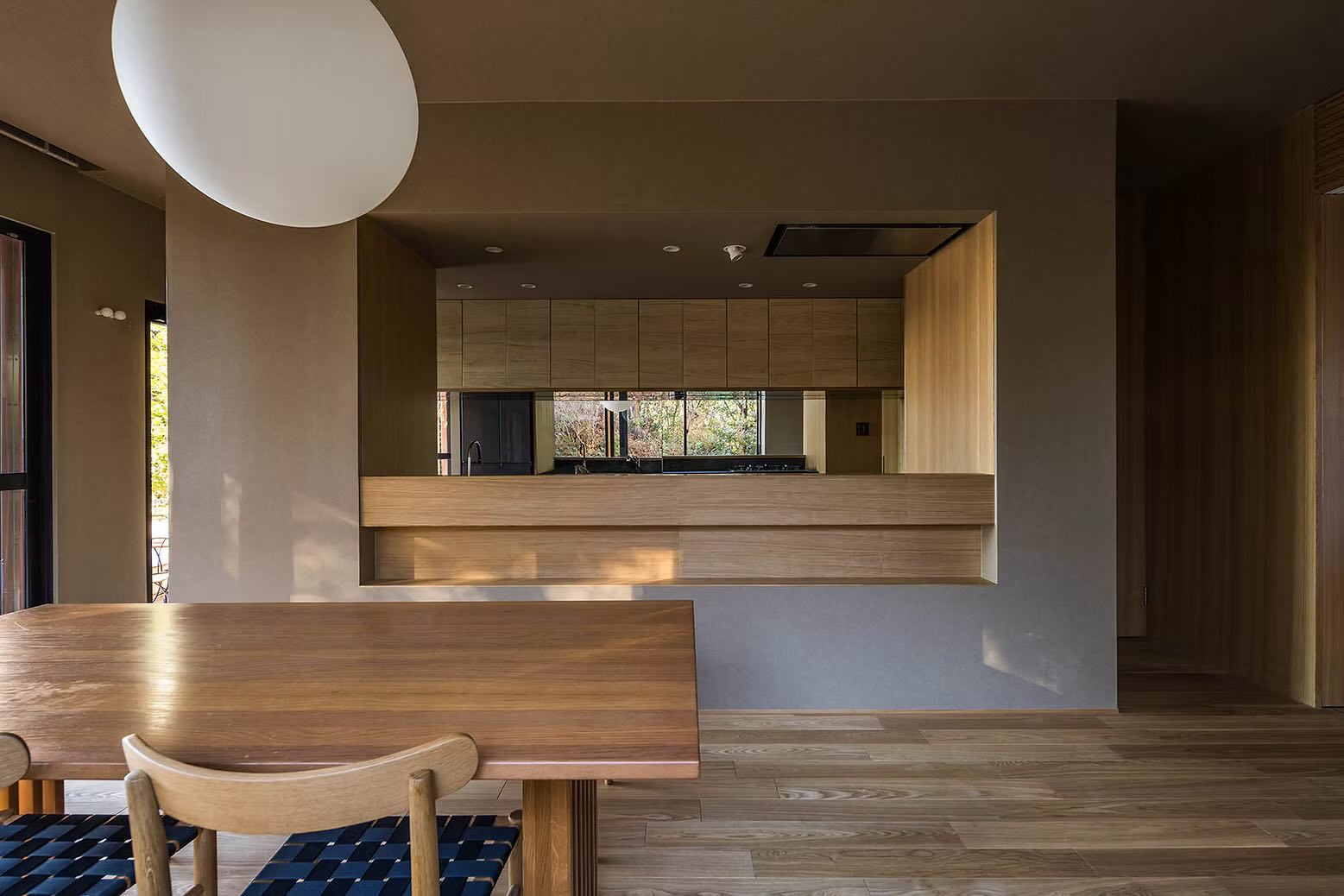 子世帯のリビング・ダイニング・キッチンは、眺望をより積極的に取り込む空間として計画しています。キッチン正面にはミラー仕上げを施し、窓の外に広がる景色を室内に映し込むことで、空間に奥行きと広がりを与えます。レンジフードを隠したすっきりとしたキッチンとし、家族3人の暮らしに合わせて、水廻りを含む生活動線は使いやすさを重視しています。