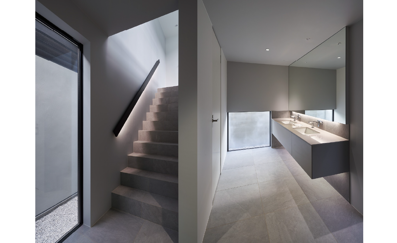 洗面でも、使う場面でだけ点けたいという要望に対し、器具を見せない位置に間接照明を仕込み、必要な明るさだけを確保しています。光を“足す”というより、視界を乱さずに“整える”設計です。