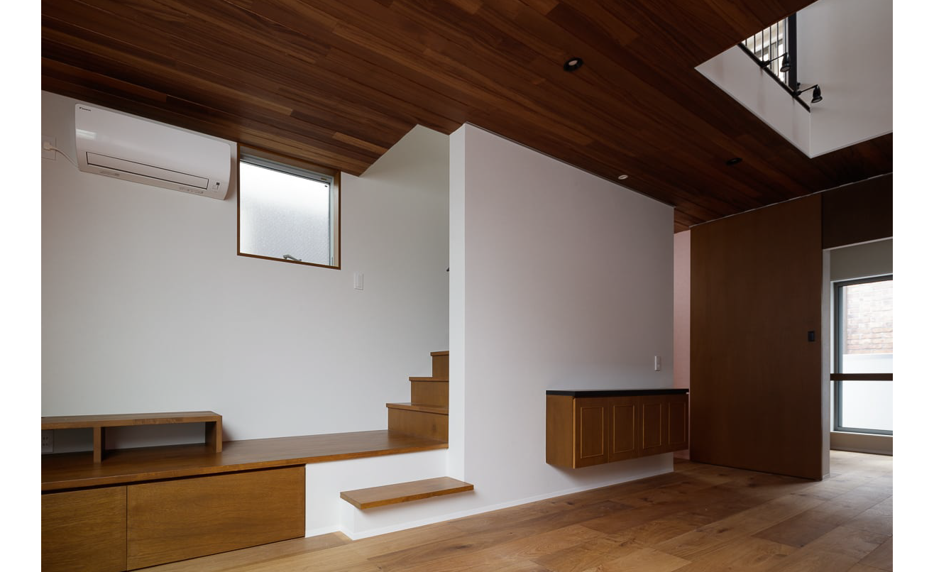 吹抜けと高窓を介して上下階がゆるやかに繋がり光や風が家全体を巡ります。狭小地であることを忘れさせる、淀みのない空間の流れ。その中に家族の気配と、それぞれの時間が静かに重なっていきます。