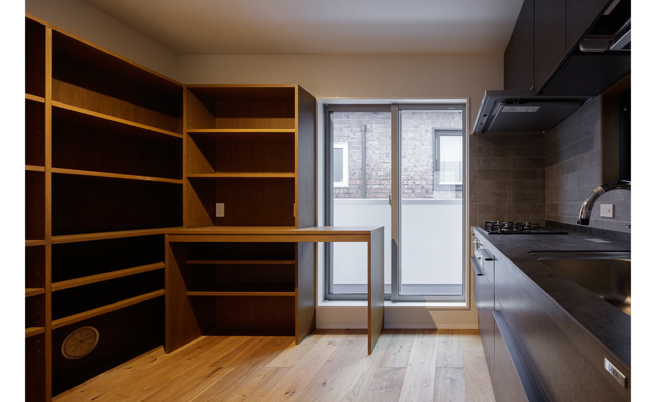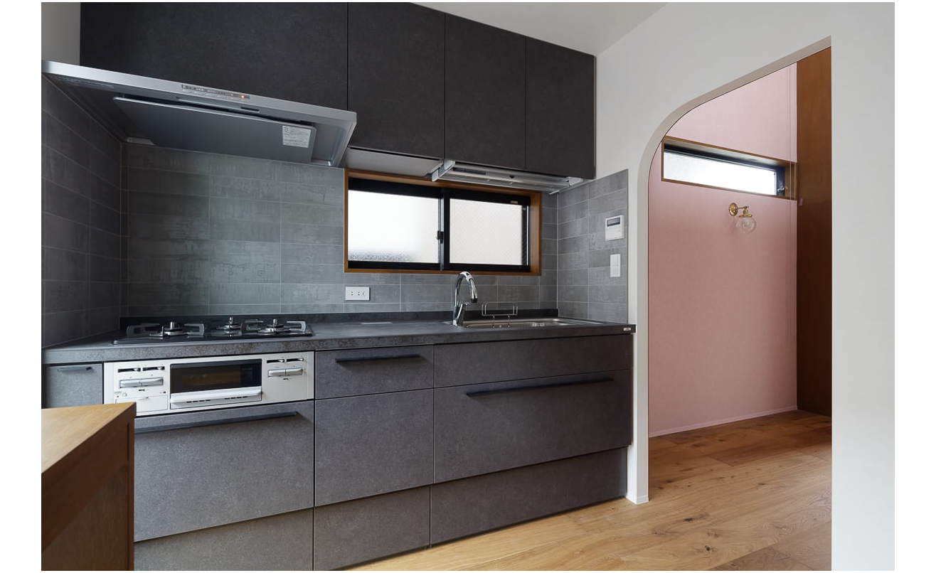 キッチンは食堂と切り離した配置。アールの開口の向こうに台所を設け、手前には洗濯や家事をこなすための作業スペースをまとめている。生活感を抑えつつ、家事効率を高める構成だ。ダークトーンで統一したキッチンと、大人モダンな雰囲気の水まわりも、この家の落ち着きを支えている。