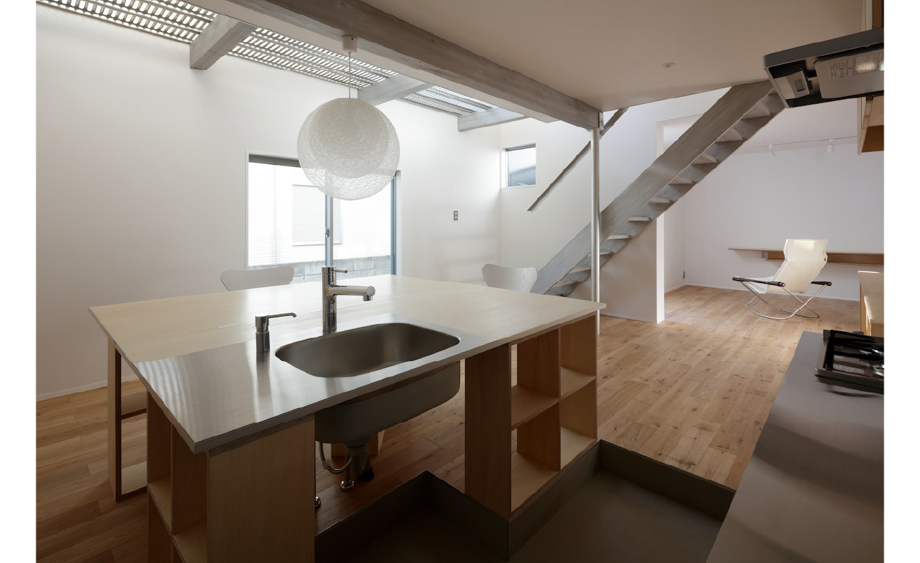 キッチンは床を一段下げ、テーブルと高さを揃えることで、作業のしやすさと視線の連続性を両立。場の切り替えが、行為によって自然に起こる構成となっています。