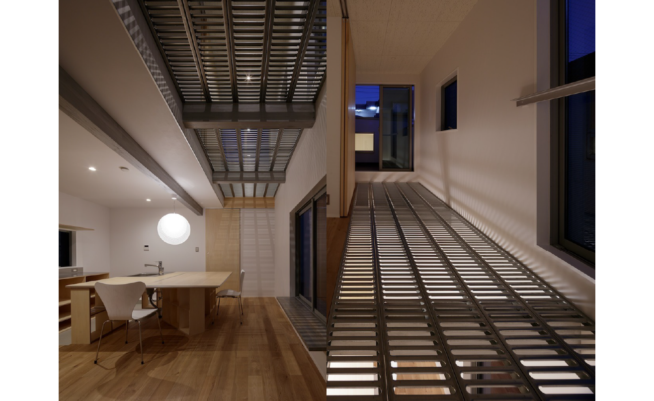 縦空間の上部には、光を柔らかく落とす仕掛けが施され、時間帯によって室内の表情が変化します。2階から屋外へと続く通路は、室内の延長として計画され、屋上テラスへと導く動線となっています。内と外を強く分けず、移動そのものが空間体験となるよう意図されているのです。