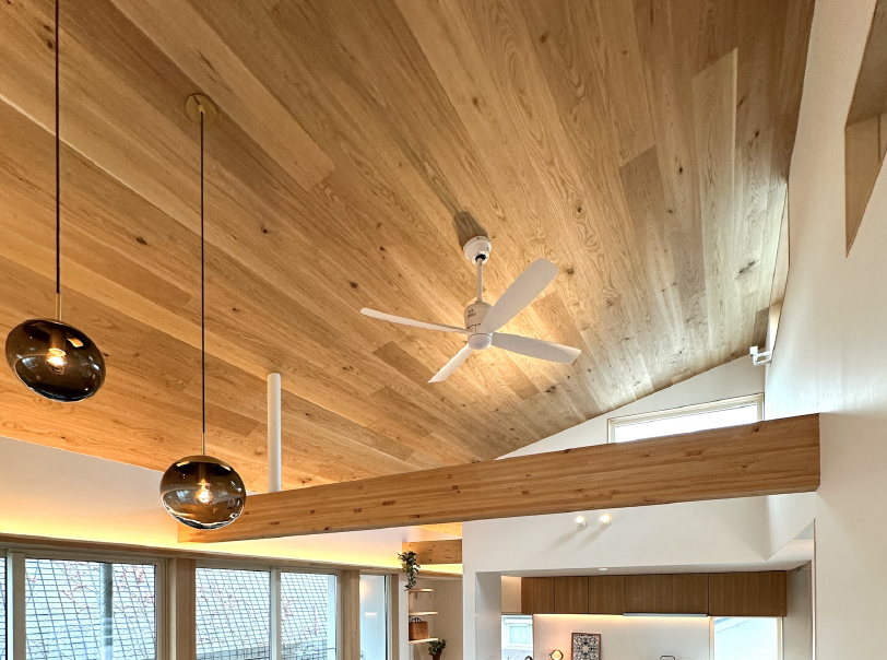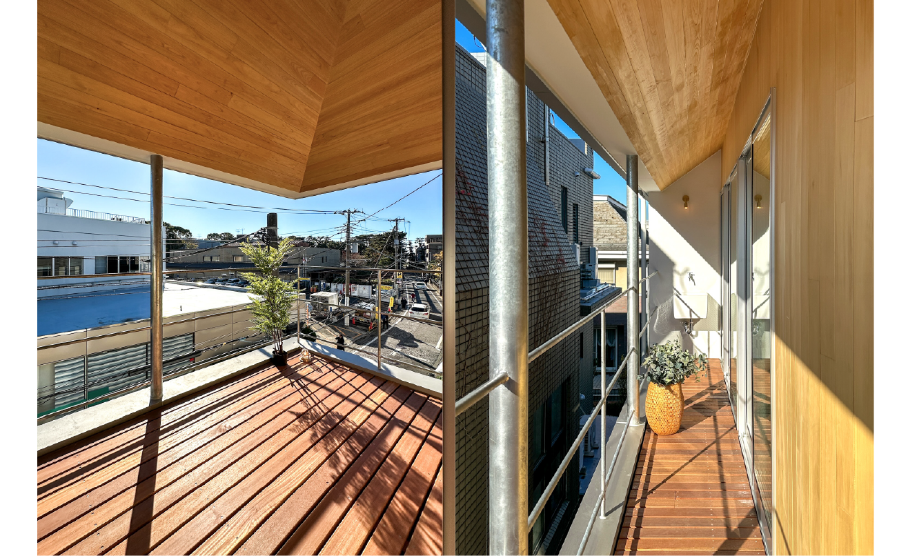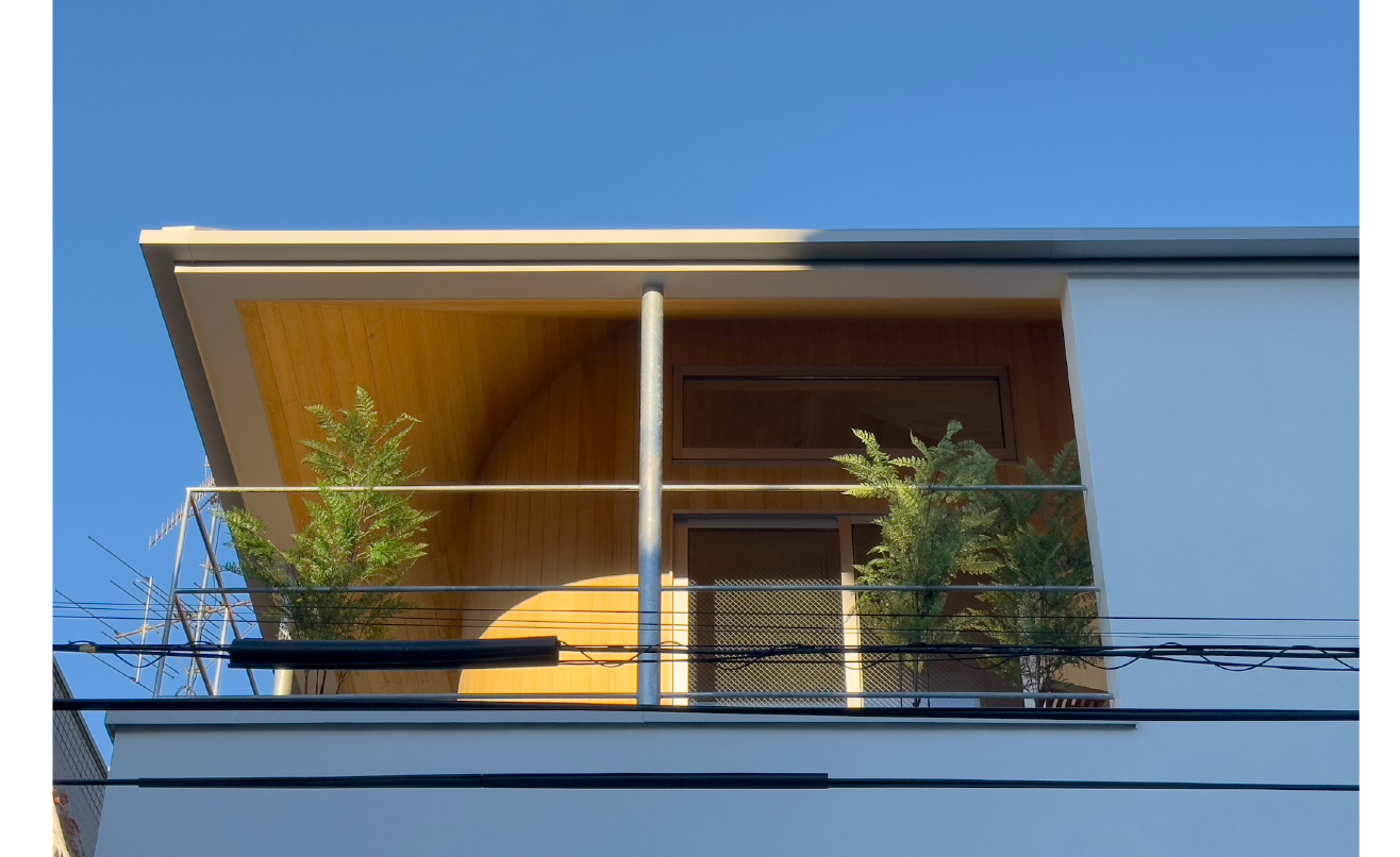 外観の大きな特徴は深く張り出した庇と、その内側に包み込まれるように設けられたバルコニーです。屋根形状に沿って天井面を連続させることで、室内から外へと視線と意識が自然に繋がり、都市に開きながらも守られた居場所が生まれています。