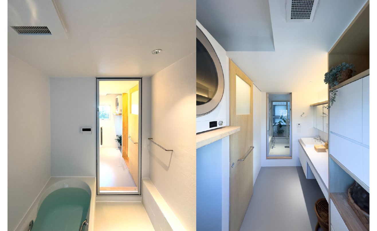 水回りは機能性と心地よさの両立を意識して構成されました。浴室は外部に向けて視線を逃がしながらも、周囲からの見え方には配慮し、安心感のある開放性を確保。