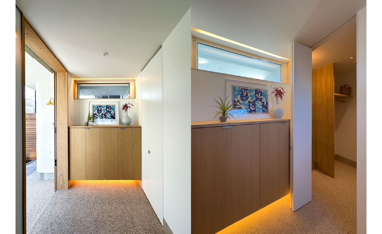 一方、母屋の玄関は用途を明確に分け、賃貸部分とは異なるスケール感と素材感で計画されています。木の建具と間接照明により、外部から内部へと気持ちを切り替えるための「間」が丁寧につくられました。