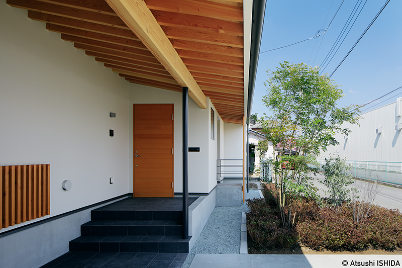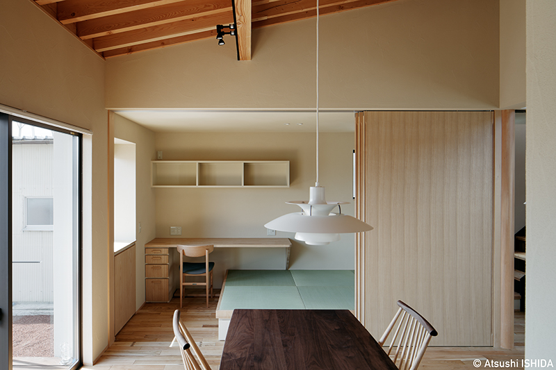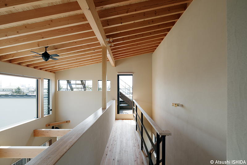 室内では、手すりに頼らずとも壁に自然と手を添えられるような工夫を施し、身体感覚を大切にした動線を計画。盲導犬と快適に暮らすため、犬用のシャワースペースも設けました。また、水害の可能性を考慮し、基礎を高くすることで安全性にも配慮しています。富士山やアルプス山脈を望む敷地の特性を生かし、屋上には小さなデッキを設置。光、風、気配を楽しみながら、日常を豊かに味わうための要素が丁寧に積み重ねられた住まいです。