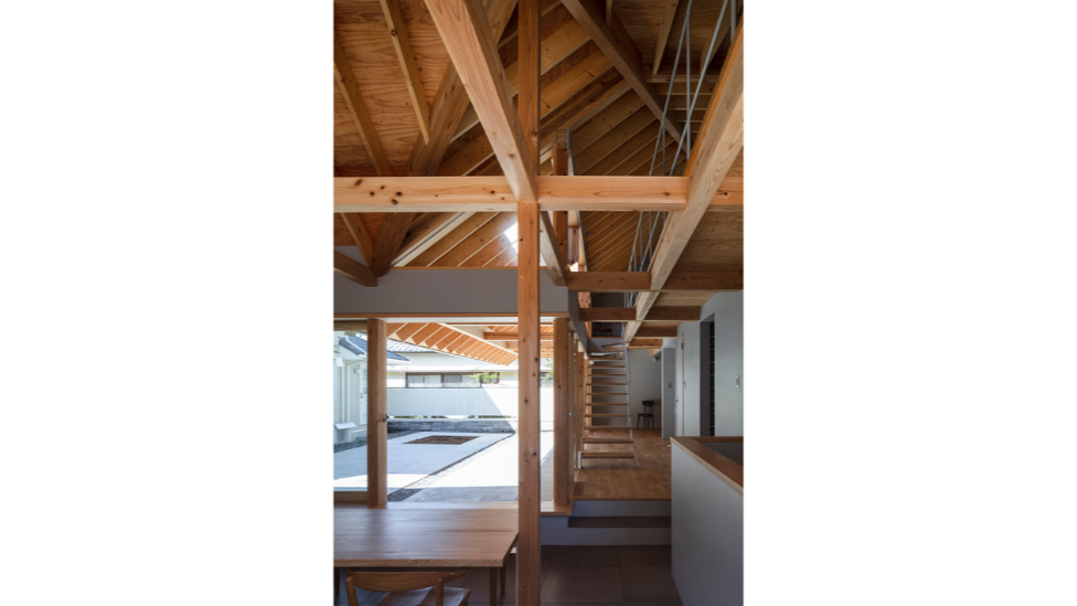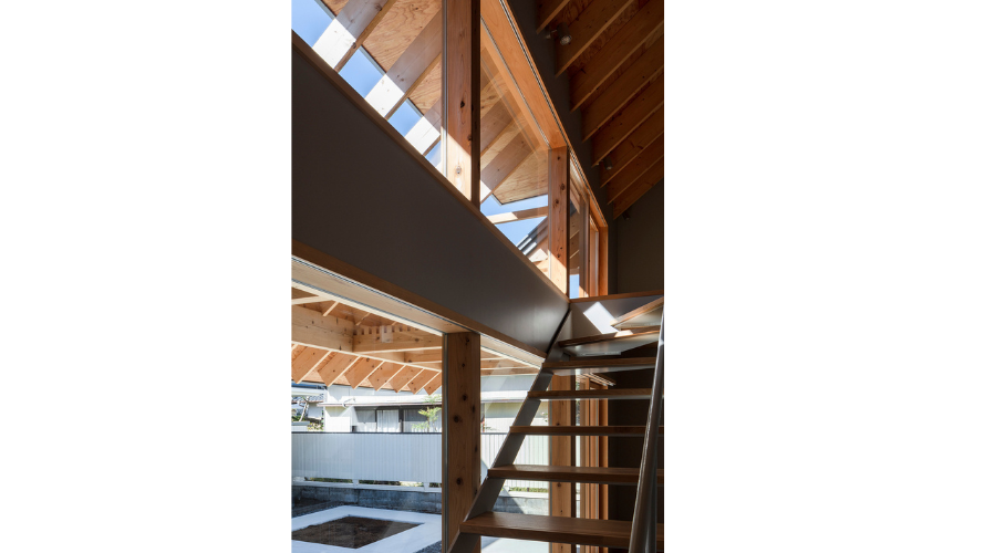 屋根の一部には光を取り込むためのスリット状の開口を設け、軒下テラスだけでなく室内にもやわらかな自然光が届くように設計。大きく軒を出すことで暗くなりがちな空間ですが、屋根に開口を設けることで、日差しを遮りながらも必要な明るさを確保しています。
