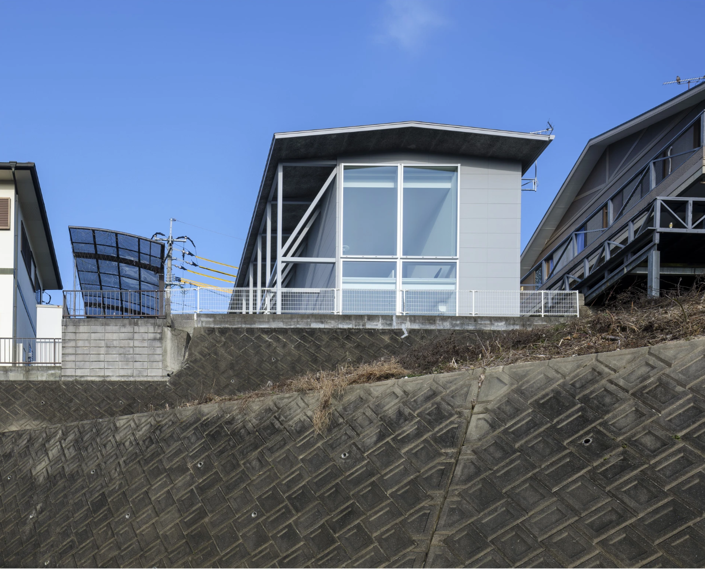 高台で東側が崖となって大きく景色が開ける場所に建つ住まい。この景色をひとつの方向に固定せず、多様な見え方が生まれるよう設計しました。