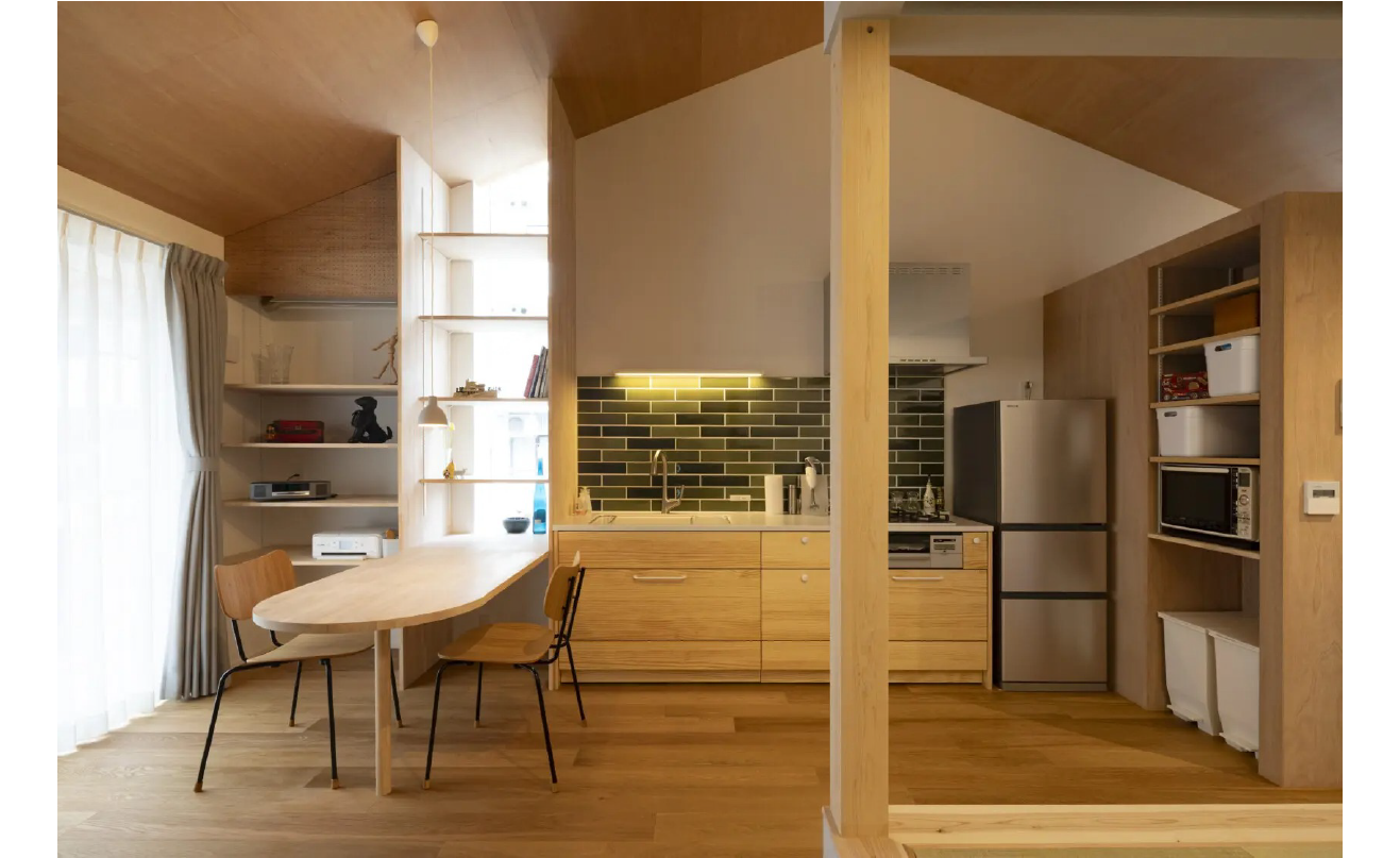 敷地は決して広くないことから、壁で細かく仕切るのではなく、スキップフロアや小上がりで高低差を持たせることで、役割を緩やかに分けています。さらに、備え付けのスタディコーナーやベンチを設けることで、居場所を点在させました。