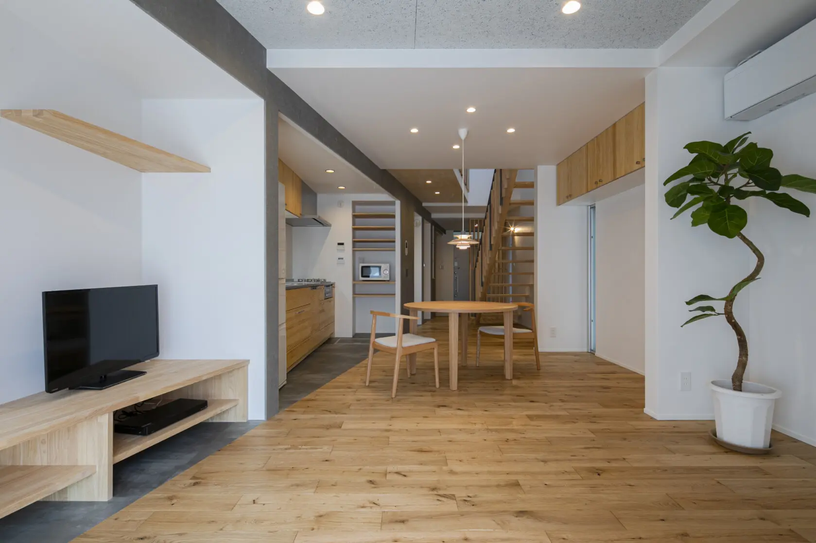 壁はすべて塗装仕上げとし、淡いトーンで統一しました。光の入り方によって生まれる陰影により、壁の色が時間帯によって異なる表情を見せ、住まいに豊かさを与えてくれます。