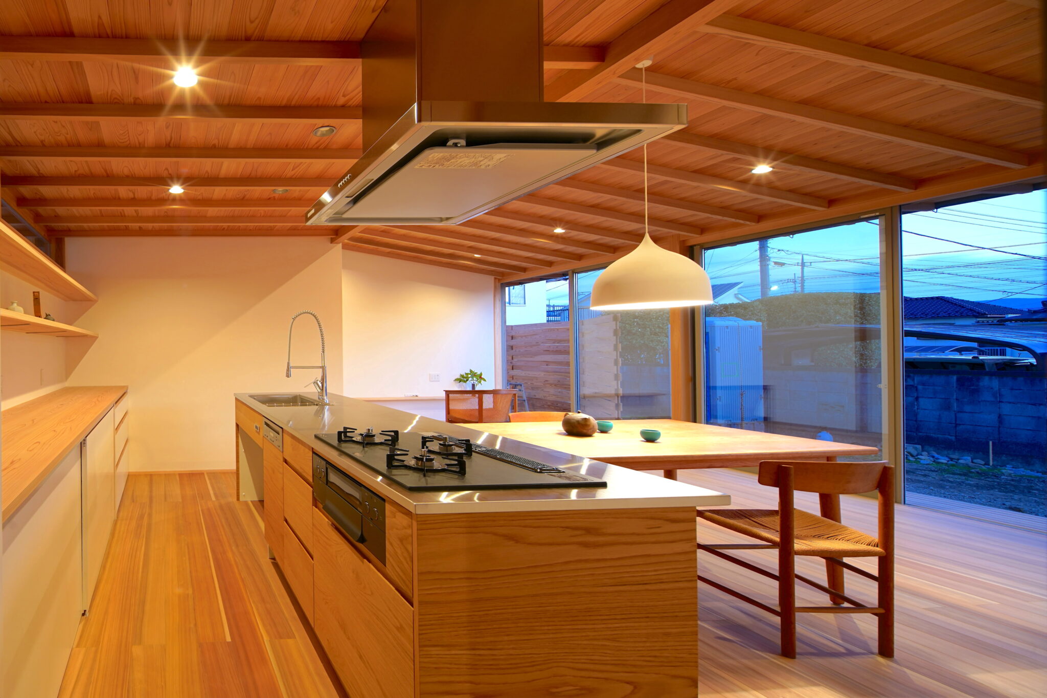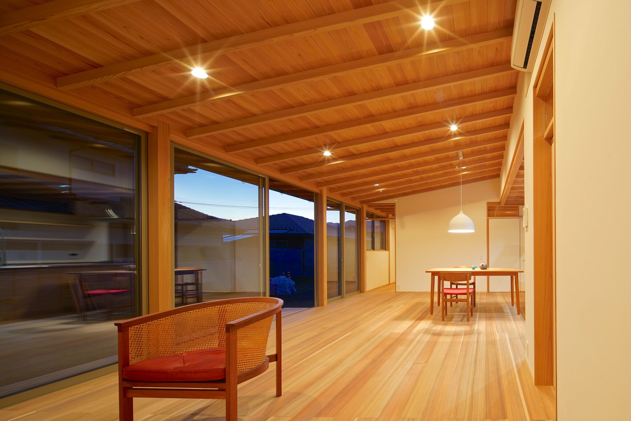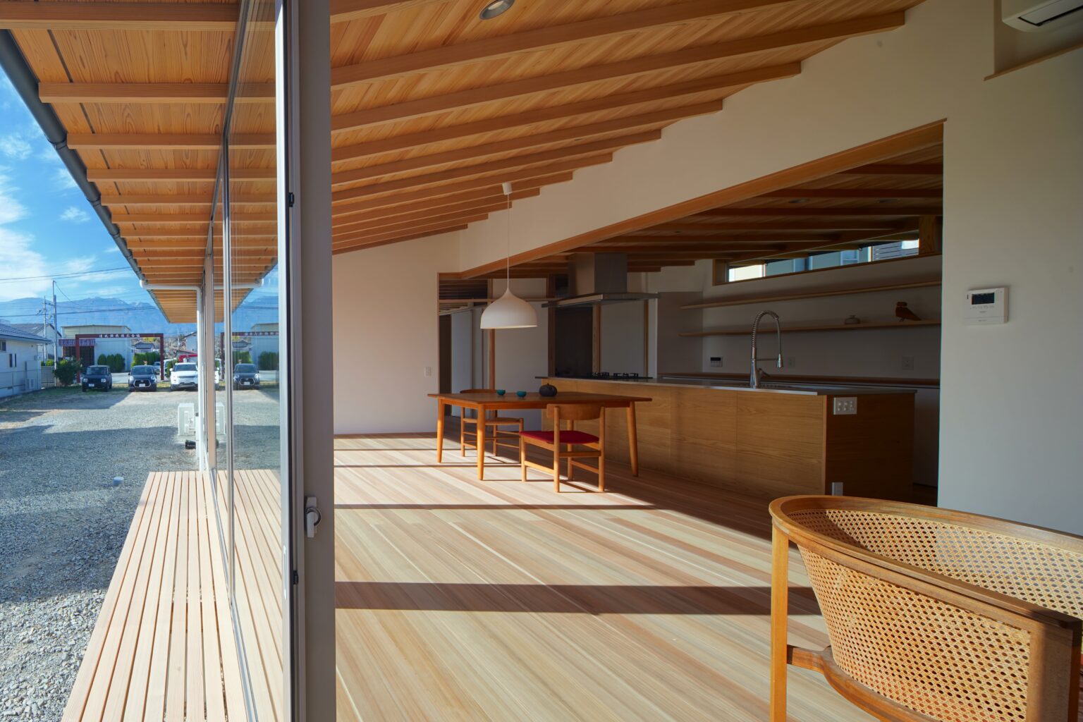 そこに天井いっぱいまで設けた大きな窓を組み合わせることで、外と内の天井ラインがフラットにつながり、室内外に一体感が生まれます。天井は陰影が生まれるデザインにすることで、時間によって表情を変えます。大きな窓から感じる四季の移ろいは、旅館など特別な場所で感じるような「自然の価値」を日常の中に取り込みます。