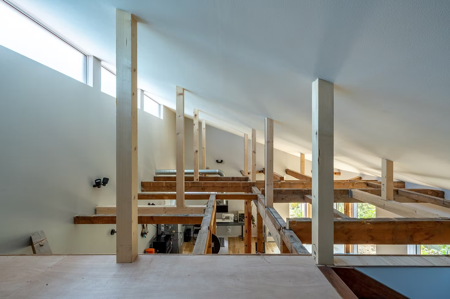 引き継いだ柱や梁はそのまま残し、間仕切りを最小限に抑えたワンルームに近い構成へと変更。経年の味わいを感じる柱や梁は空間のアクセントとなって、屋根裏部屋のようなどこか懐かしい雰囲気に仕上がりました。