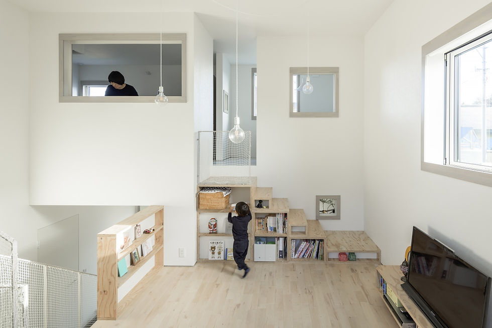住まいは住宅密集地の中心にあり、建物の中央部には光が届きにくく、室内は暗い印象でした。そこで、屋根が重なり合う部分を少しずらすことで北側から光を取り込み、室内全体を明るくしました。