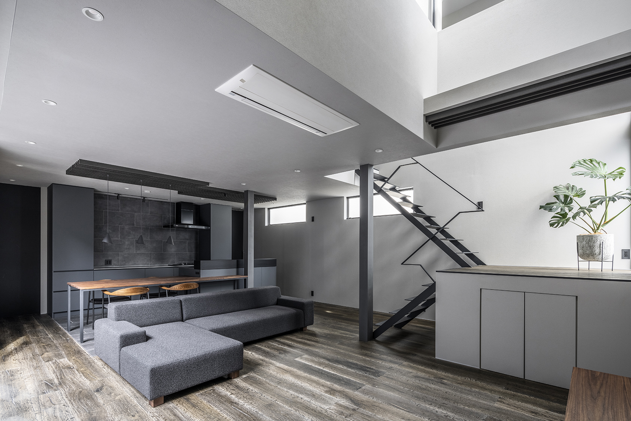内装では、シンプルな構成でモノトーンを基調とすることで色数を抑えました。暮らしが始まれば生活用品など自然と色は増えるため、バランスを取りやすいよう余白を残しています。