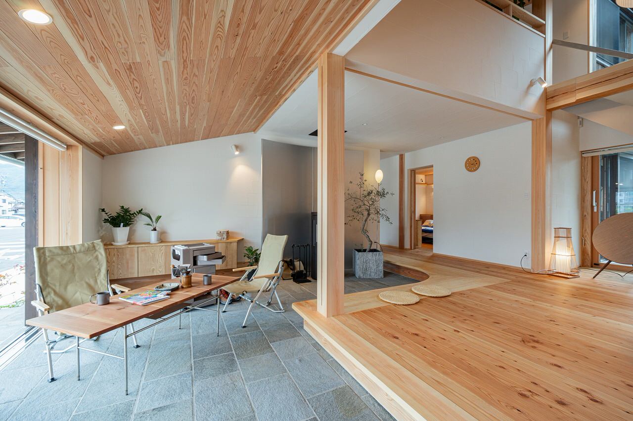 ストーブを囲むようにあえてカーブがかかったフローリングに家族や友人と腰をかける。