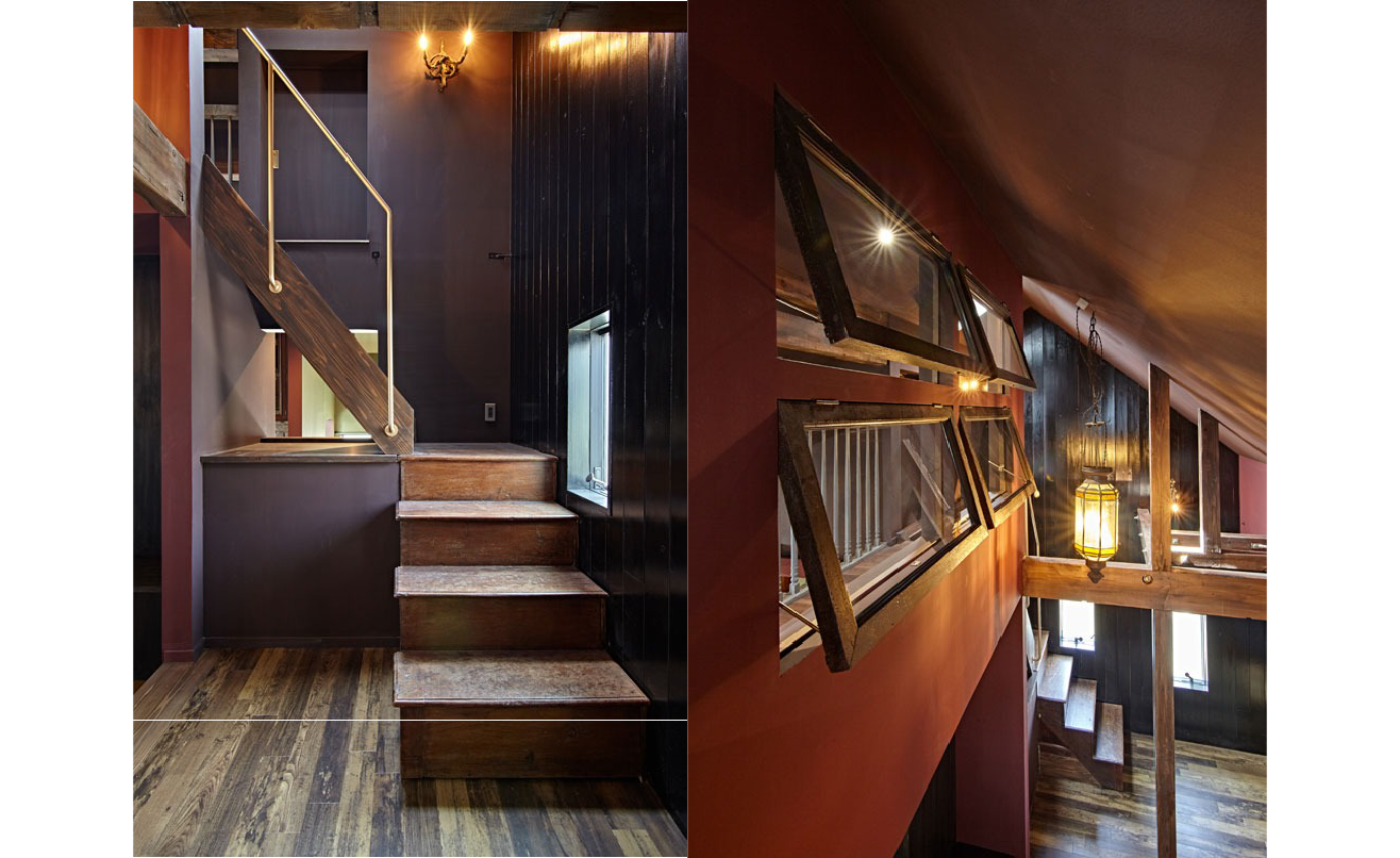 リビングからロフトへ上がる階段には、施主所有の階段状収納家具を転用しました。スペースに余裕がない中で構造的に補強を施して手すりを新たに造作。上部には金色を塗布してインテリアの象徴的存在として際立たせています。