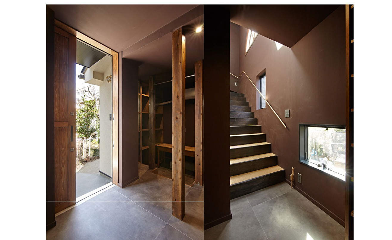 玄関は黒い大判塩ビタイルで引き締め、外部から内部へと世界観を切り替える場に。増築された階段へと自然につながる動線の中で、素材のコントラストが印象を強めます。