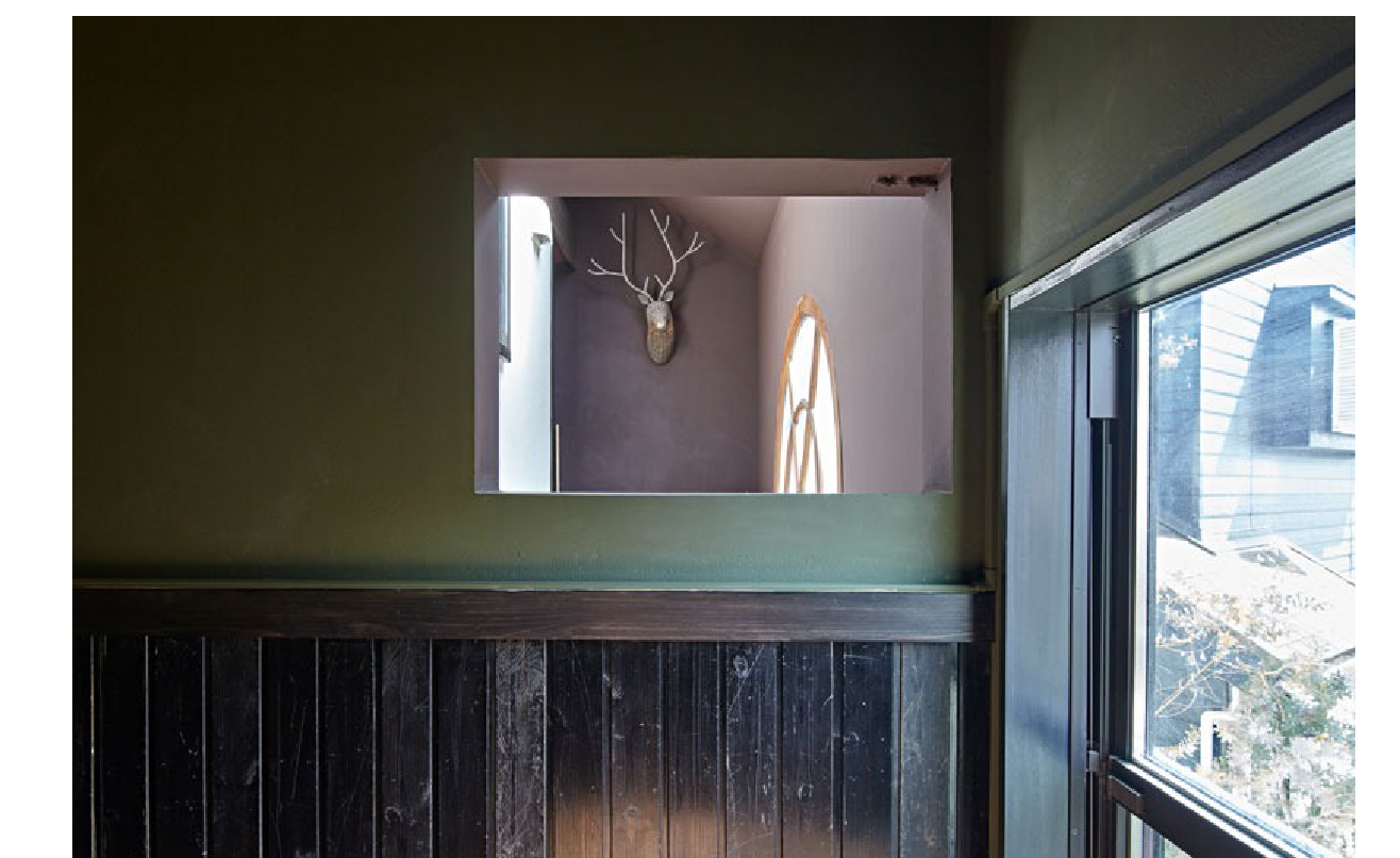 増築後の旧階段スペースは約2畳の書斎へと転換されました。緑色の壁に包まれた小空間にアンティークデスクを据え、壁をくり抜いて階段下の光を取り込む構成。移動のための場所だった空間が、思考のための場へと意味を変えています。
