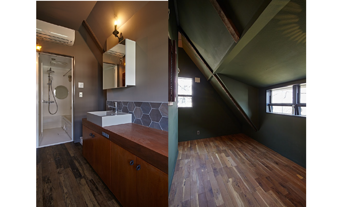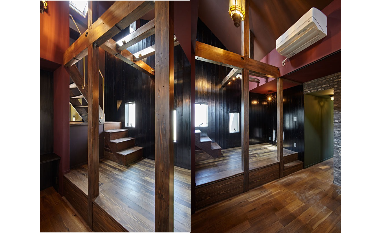 屋根勾配が低い位置から立ち上がる個室では、デッドスペースをヌックとして積極的に意味づけました。対照的にLDKは限りなく開く。閉じる場所と開く場所を明確に対比させることで、空間体験にリズムを与えています。