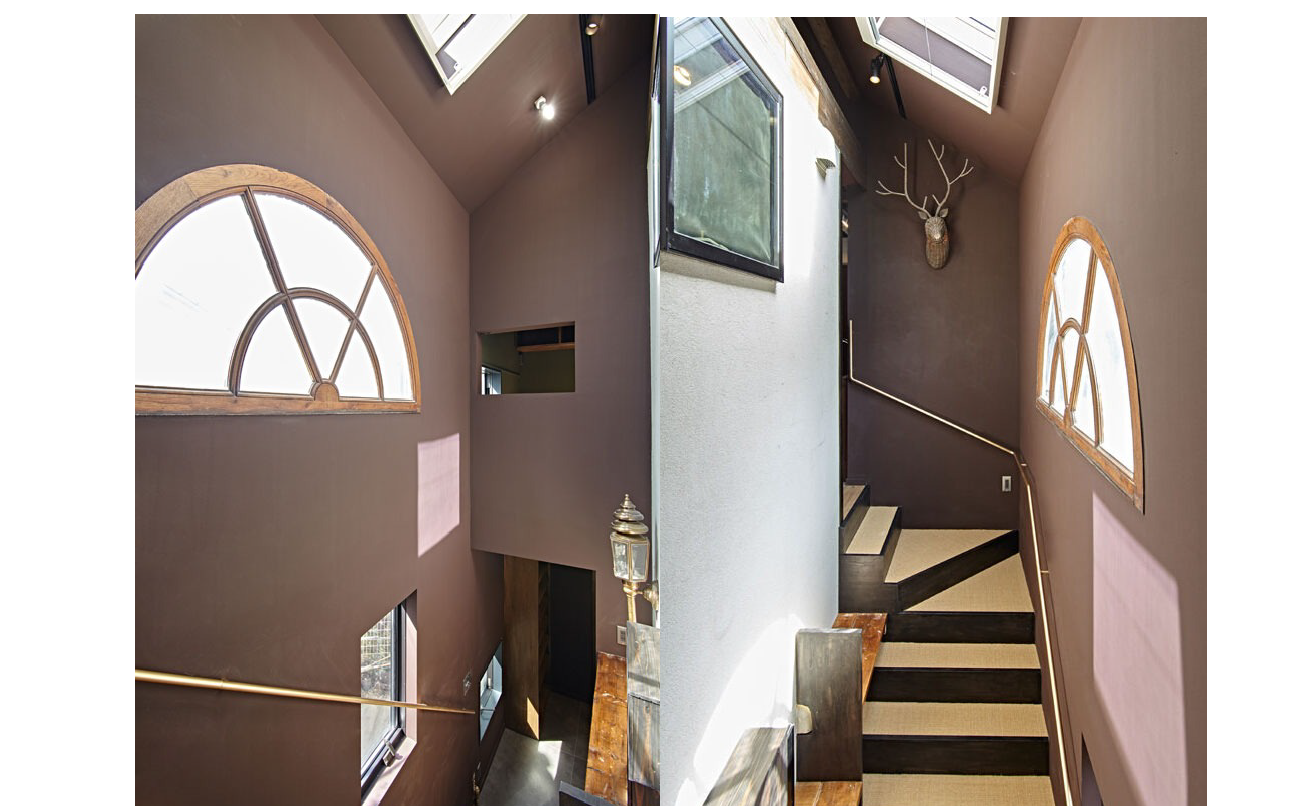 増築した階段は幅を広げ勾配を緩やかに設定。単なる機能改善ではなく、既存外壁をあえて室内側に現し、トップライトとベンチ、植物の居場所を設けることで外部のような空間として再構成しています。