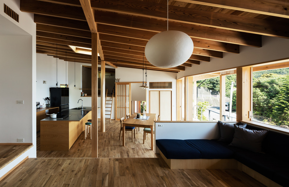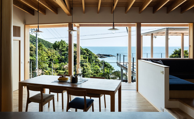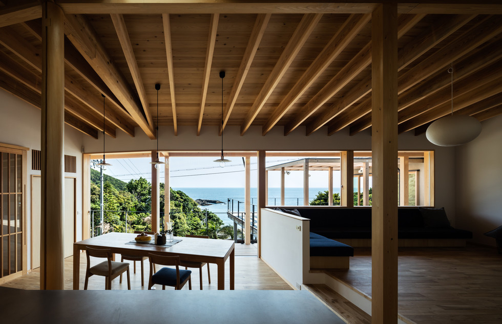 『白浜町の家』は目の前に海が広がる素晴らしい眺望の敷地です。そこでLDKの設計をする際に、室内からもこの景色を視界を遮るものなく眺められ、天井面も汚くしない方法を考えました。