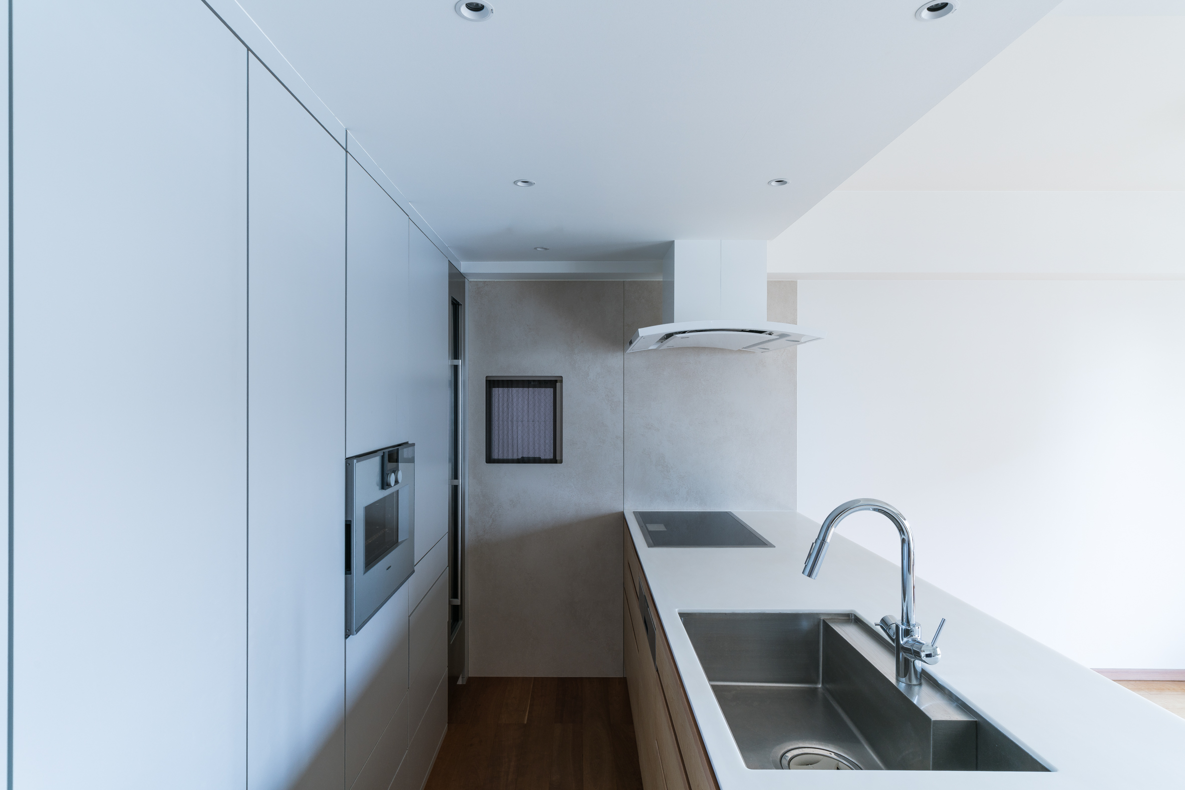 通常のレンジフードは、かなり存在感があるので天井に取り付けるとこの開放的な空間ではノイズになってしまいます。そこでレンジフードを見せない方法を模索して、使用時のみカウンタートップから整流板が上がってくるタイプの下引き換気扇(排気をキッチンの下へ引いて外へ排気する換気扇)を採用することにしました。この整流板が昇降するタイプは国内メーカーではキッチンマインドさんの他にはないと思います。換気扇単体で購入できるものではないので、キッチン自体がキッチンマインドさんへのオーダーでの作成です。