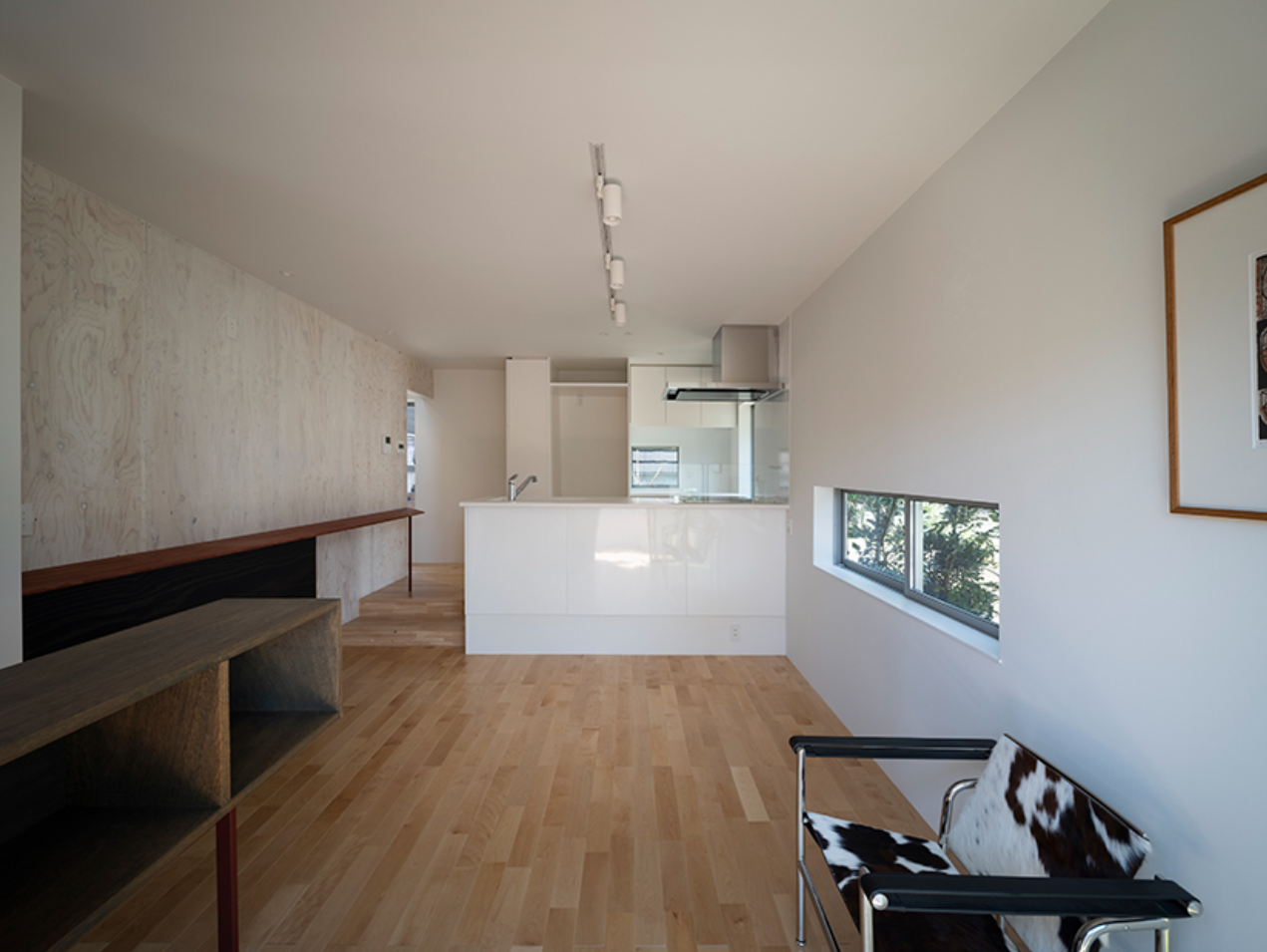 例えば、壁です。この住宅は、リビングの壁に構造用合板というものを使っています。一般的に構造用合板は表に出てこない下地材で、安価なものです。これを壁の仕上げ材としてそのまま使うことでコストカットができます。