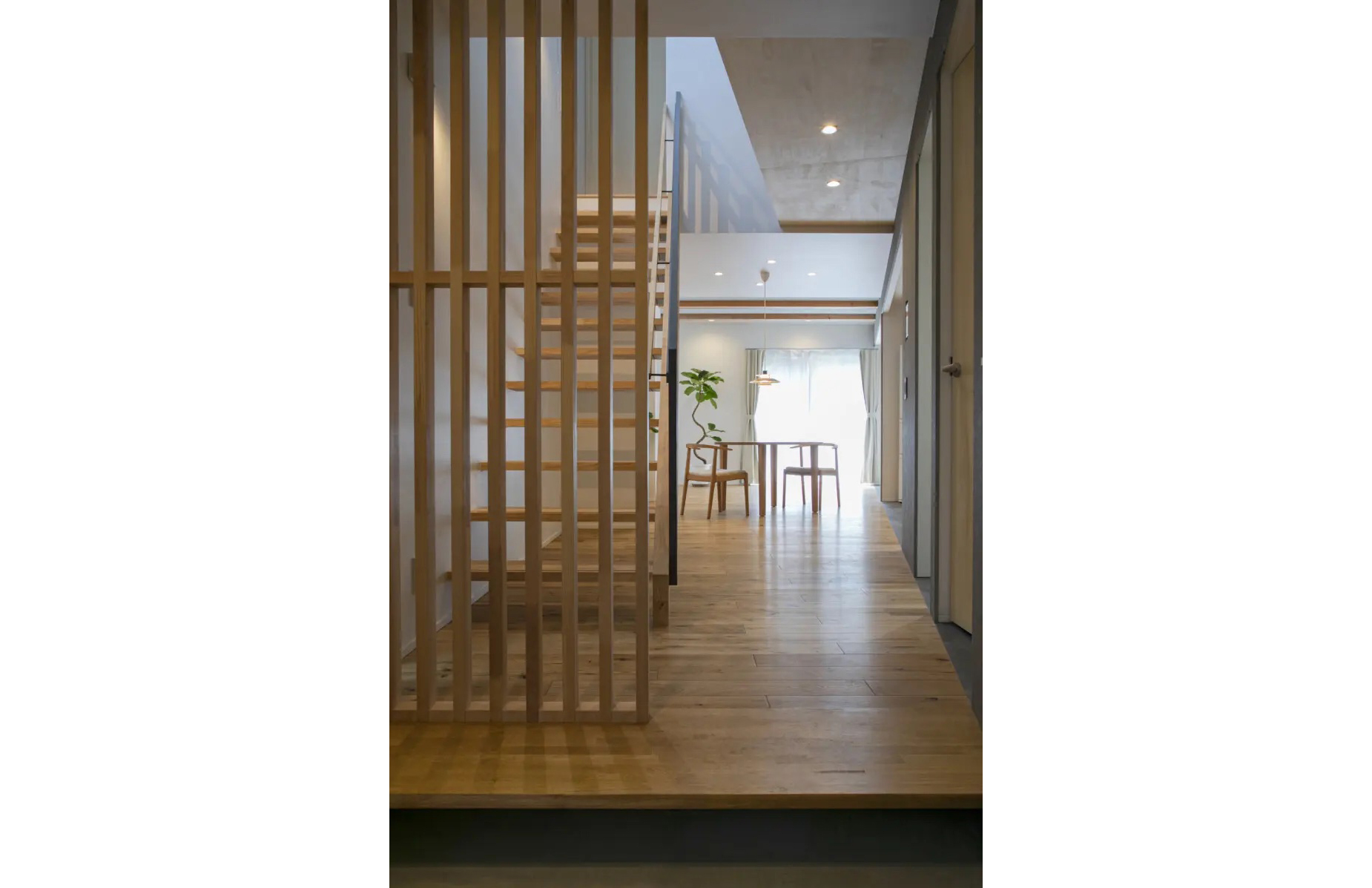 住宅密集地で横幅が狭く縦に長い敷地。いかに広く、立体的に感じる空間にするか、床、壁、天井ともに目の錯覚を利用し工夫した住宅です。