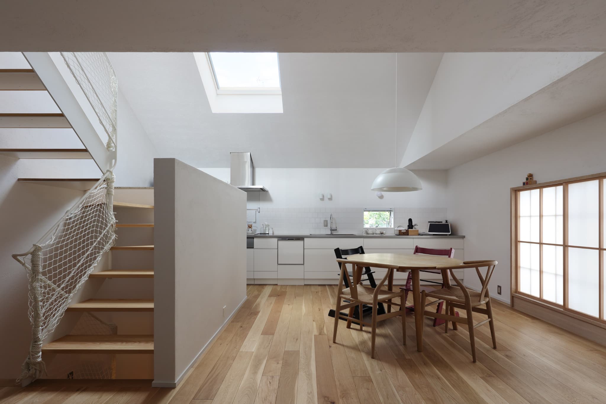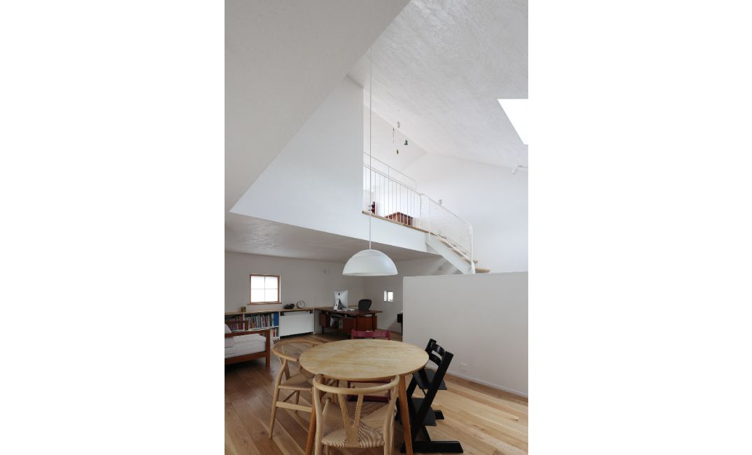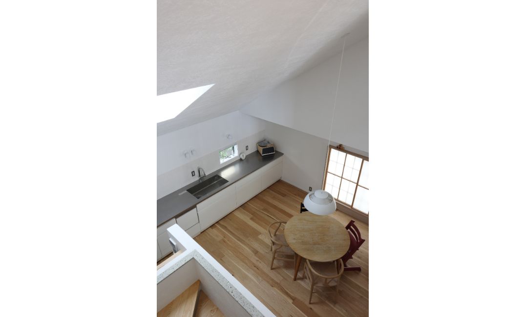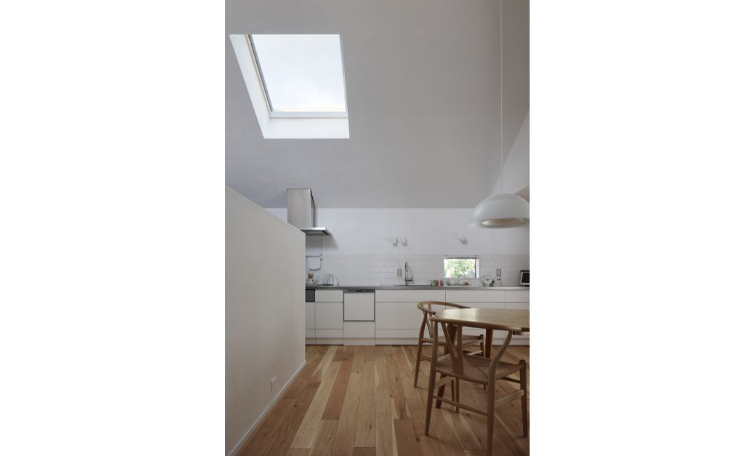 写真の『岡本の住宅』では北側のキッチンの吹き抜けに天窓を設けました。北側は直射日光ではなく安定した光が入るため設置箇所としておすすめです。光が届きにくい北側の部屋にも自然光が感じられ生活も快適になります。もちろん立地や構造により南側に天窓を設けることもあります。その場合は外付けブラインドをセットにして、日射しの調整ができるようにしています。今は断熱性能などの機能面も向上していますので、ぜひ自然光を感じられる天窓を取り入れてみてはいかがでしょうか。
