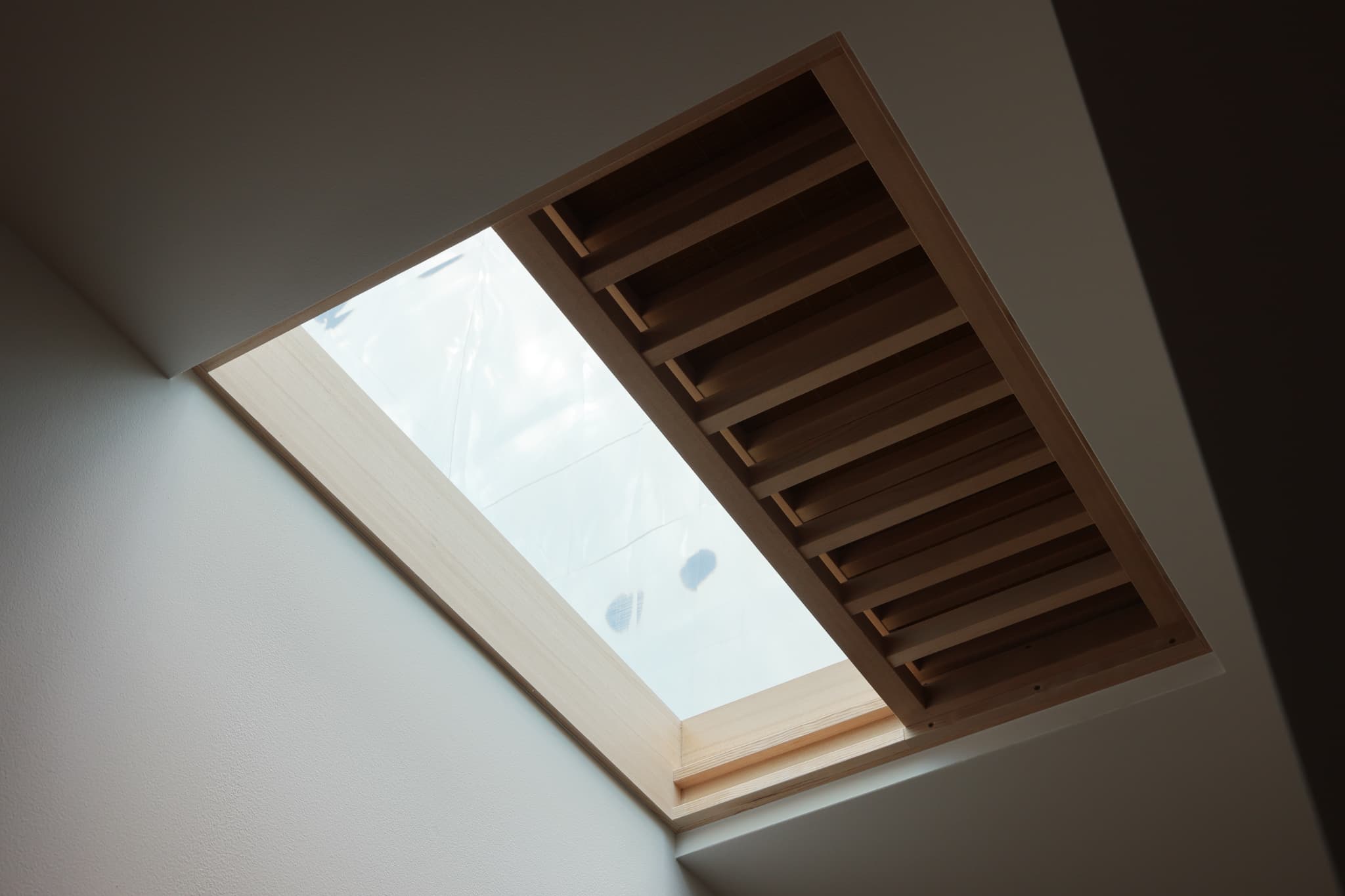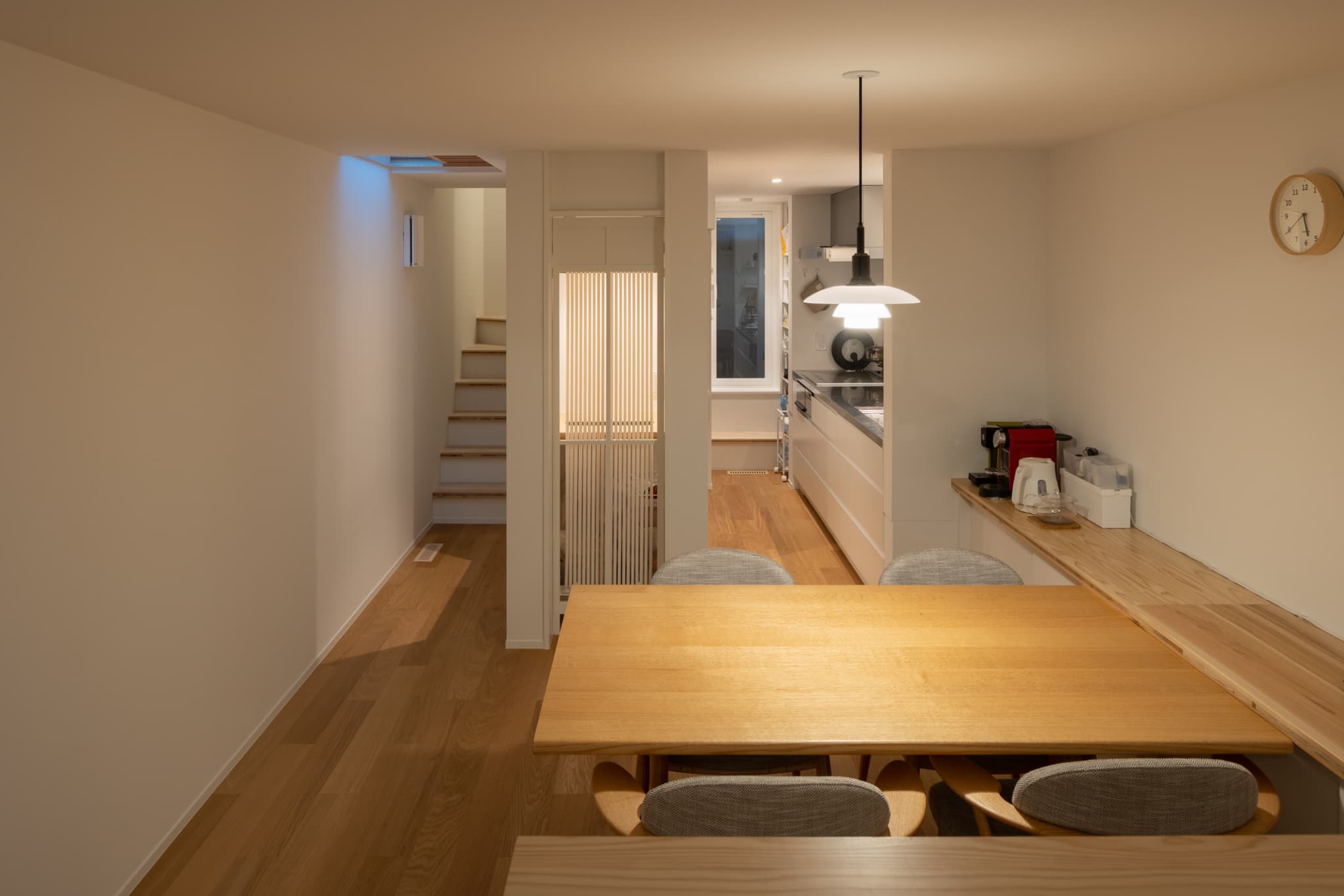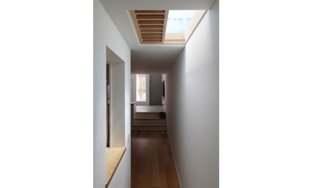 密集地や狭小住宅で光が届きにくかったり、半地下のような構造でも自然光を建物内部に取り込み、照明として使用する工夫です。これには通常のトップライト(天窓)と光ダクトという内側が鏡状になったダクトを使用します。私は、光ダクトは東洋鋼鈑の『どこでも光窓』という製品を採用しています。トップライトから取り込んだ光をダクト内部の鏡面に何度も反射させながら運び、写真のように3層下の半地下のフロアにも届けることができます。外の明るさに応じて射し込む光も変わるので、建物の中でも自然光の変化を感じることができます。