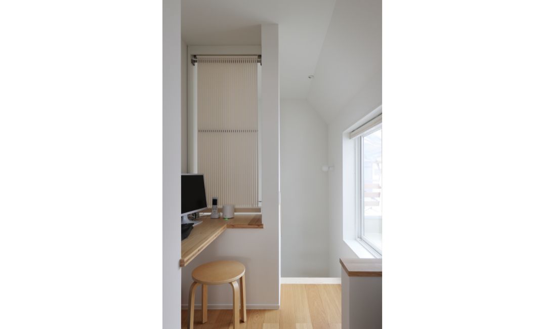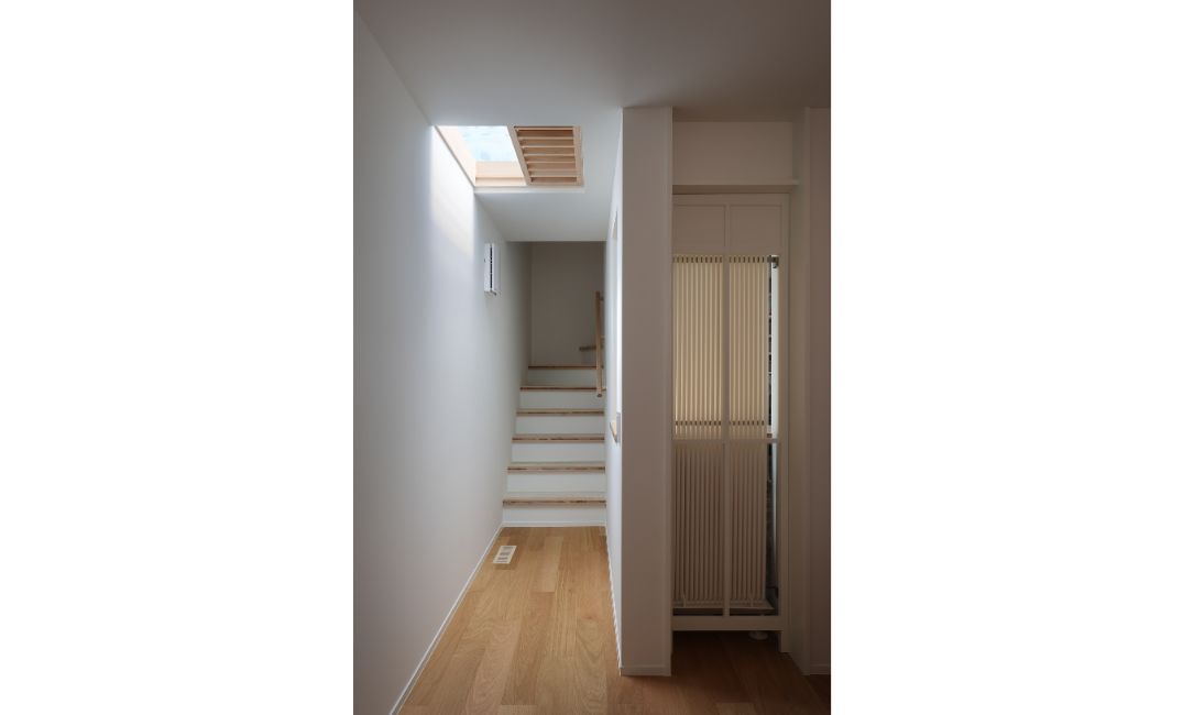 『瑞江の住宅』ではふく射冷暖房を採用し、その暖気、冷気を効率的に各フロアに届けるため、空気の通り道を工夫しました。別記事の『半地下でも自然光が届く トップライトの明かりを運ぶ光ダクト』で紹介したのですが、この住宅には3層上のフロアのトップライトから半地下に光を届けるために家の中を走る光ダクトがあります。これは自然光を反射で届けるため内側が鏡面になっているダクトです。これを光だけでなく空気の通り道としても使用しています。写真1枚目奥の階段の手前に光が落ちている箇所、これが光ダクトの開口部分です。そして写真の手前右上に見えているのがふく射冷暖房のパネルと空気の通り道であるガラリです。このダクトとガラリで吹き抜ける箇所をつくることで空気が家の中を循環できるように設計しました。