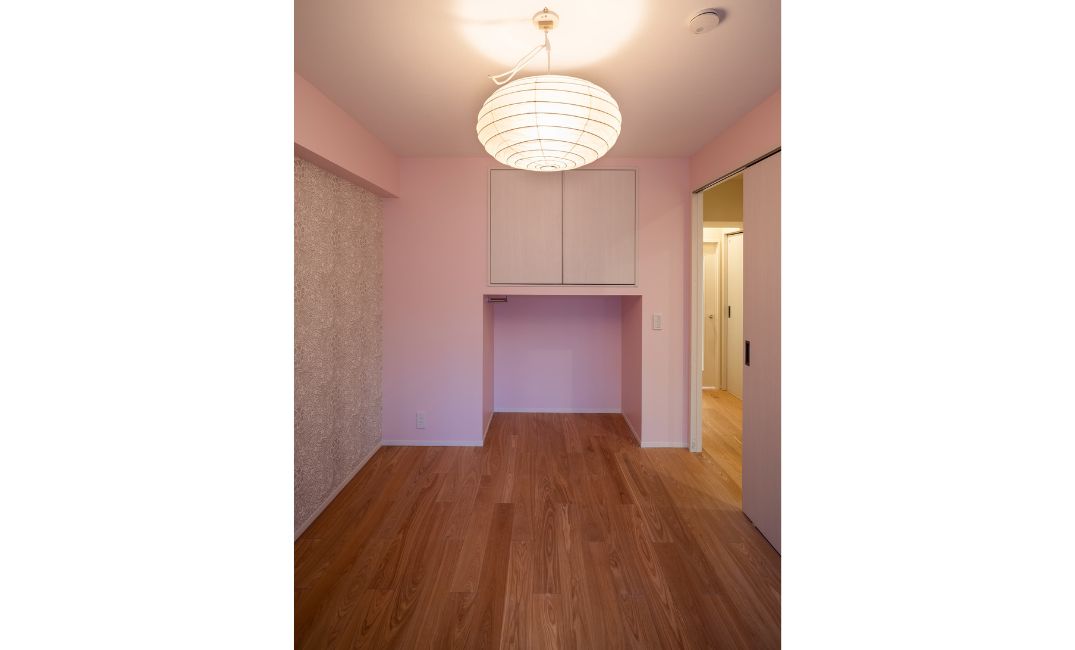 その人らしさがある空間にするため、施主の方と一緒に輸入壁紙専門店のショールームに出向き、数多くの中から選び抜きました。トイレの他にも北側でやや暗い印象のあった寝室がピンクと柄の壁紙を組み合わせた仕上げで明るい空間になりました。アートを飾るような感覚で壁紙を選び、「せっかくだから個性が現れる何かをしたい」という施主の方の希望を叶えることができました。