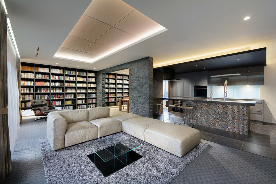 遊び心を兼ね備えた独創的な宙に浮いたデザインのキッチンカウンターは、明るい印象の他の部屋との差を出すため、天井を低くし間接照明を使って工夫しています。「ゴージャス感が欲しい」というご希望から、タイルにはゴールドが入ったものを採用。光の不合で表情が変わり、よりインパクトを与えました。