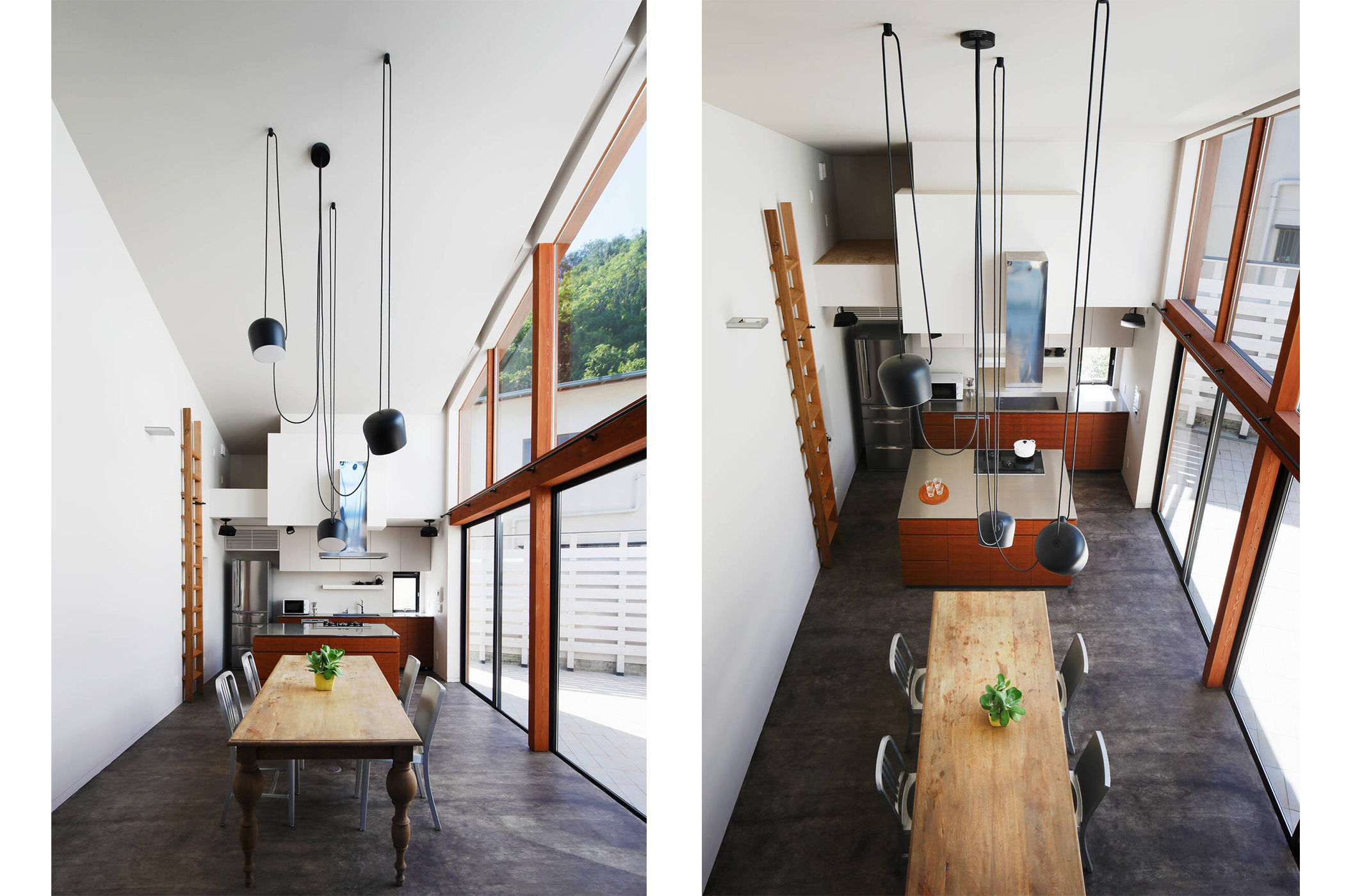 IRITA BEACH HOUSEの吹き抜けで使った製品です。ボリューム感とスタイリッシュさを併せもっているペンダントライトです。絶妙な大きさで吹き抜けのような高いところでも存在感がありますが、大ぶりすぎず、ダイニングにもマッチします。長くデザインされたコード部分で光源の方向や高さを調整できるようになっているのでイメージに合う光を演出できます。