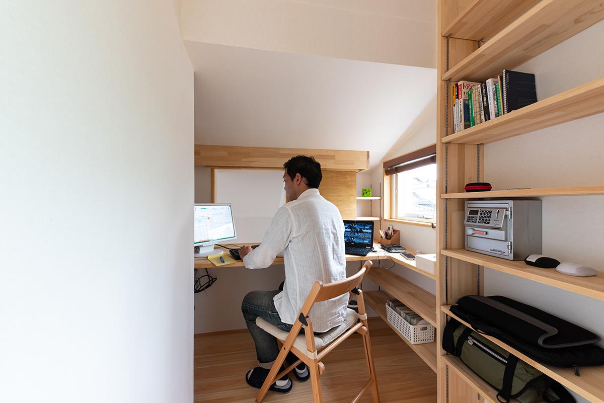 空間を効率的に使うため、物干しスペースと一体になっています。奥まった場所ゆえに集中しやすい環境になっています。一方、デスク前の窓を開けると吹き抜けを介して、1階のLDKで過ごす家族と簡単にコミュニケーションを取ることもできます。