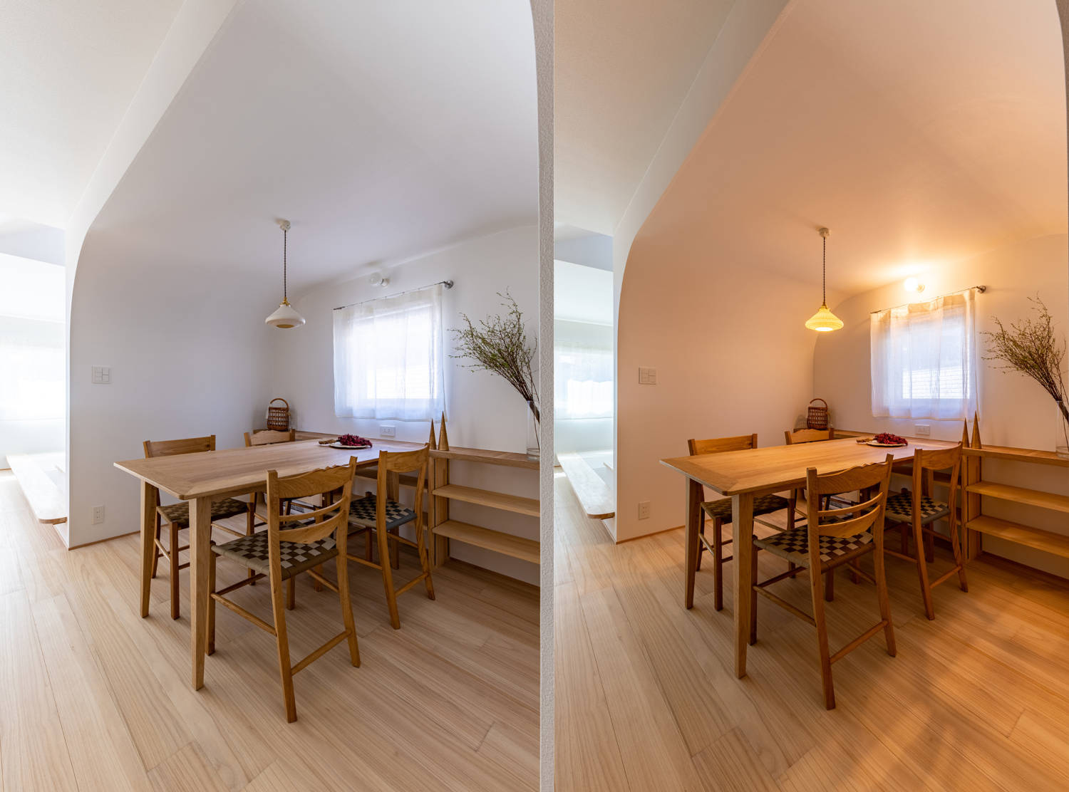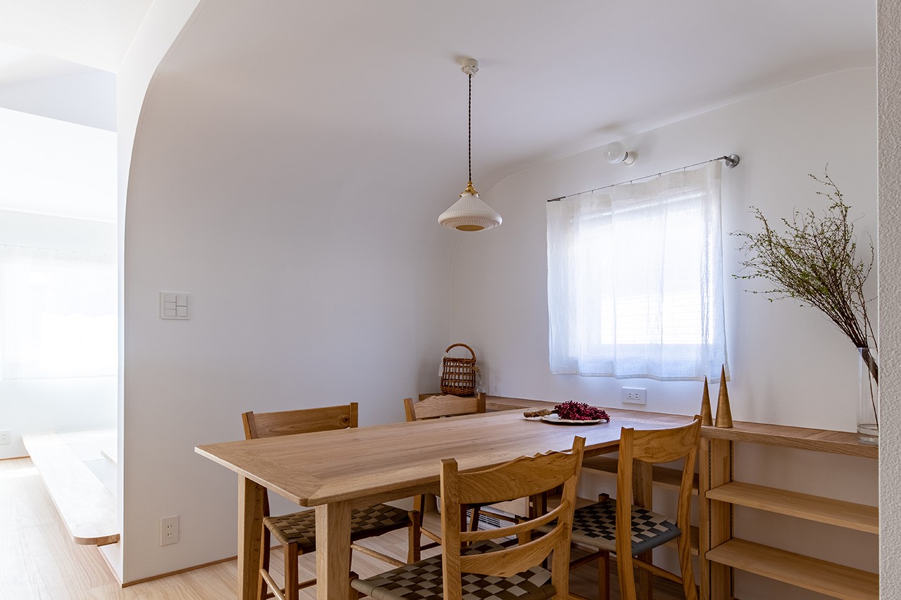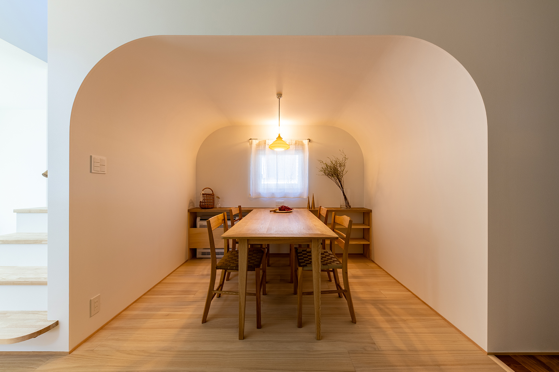 「こもり感のある場所にして欲しい」というお客様のご希望から、天井から壁をアールのデザインにすることで、かまくらのようなダイニングをご提案しました。