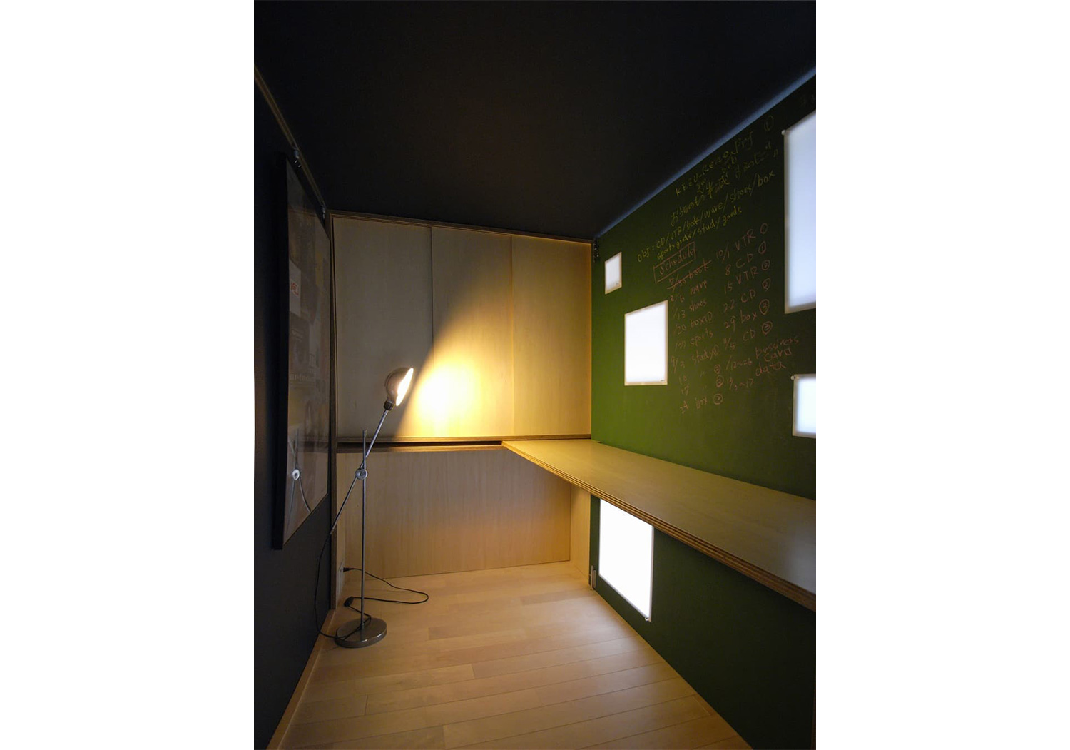 壁面に収納されたL型間仕切り壁を引き出して、引戸を閉めると1.5畳の部屋をつくることができます。1.5畳のスペースには壁面に収納があり、折りたたみ式のカウンターデスクを設置することで、書斎として利用できます。