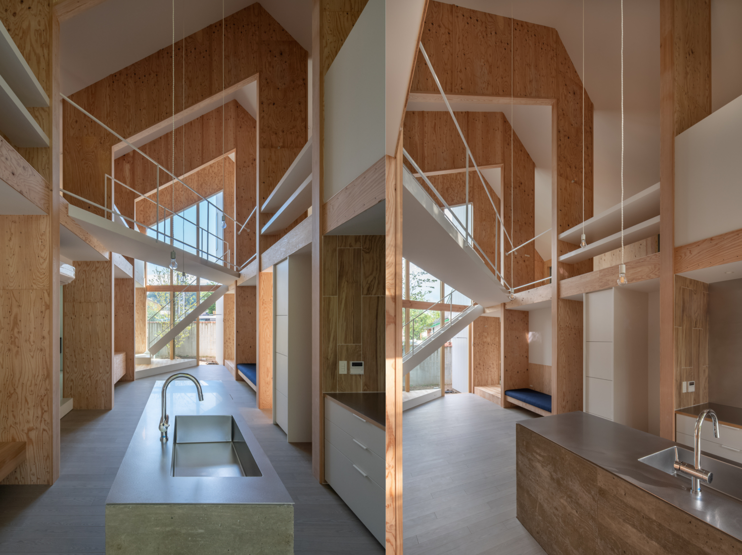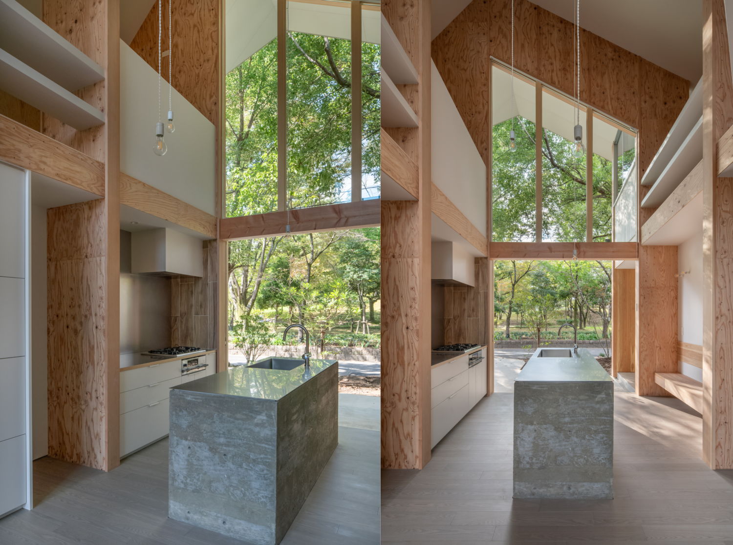ダイニングキッチンの真ん中に吹き抜けをつくり、景色に空間がつながるよう設計をしています。