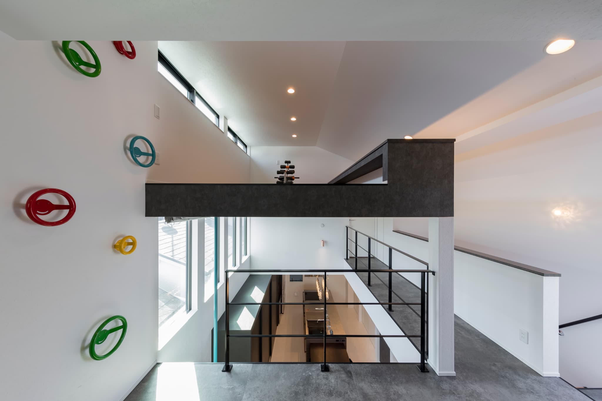 都会的で開放的なデザインの住宅ですが、吹き抜け部分にのぼり棒とDECO バブルズというボルダリングができる室内アスレチックを設置しています。のぼり棒は2階と3階の吹き抜け部分をつないでおり、3階から伝って降りてくることができます。ご主人は登るほうも試されたようですが、大人にはなかなかハードだったようです(笑)。DECO バブルズはアクティビティだけでなく、3階と吹き抜けの上部スペースをつなぐハシゴ代わりの役目も担っています。この箇所に関しては施主の方と相談の上、割り切って他のハシゴなどの設備を設けなかったので、上がるためには必ず運動をすることになります。まさに『アスレチックする家』です。