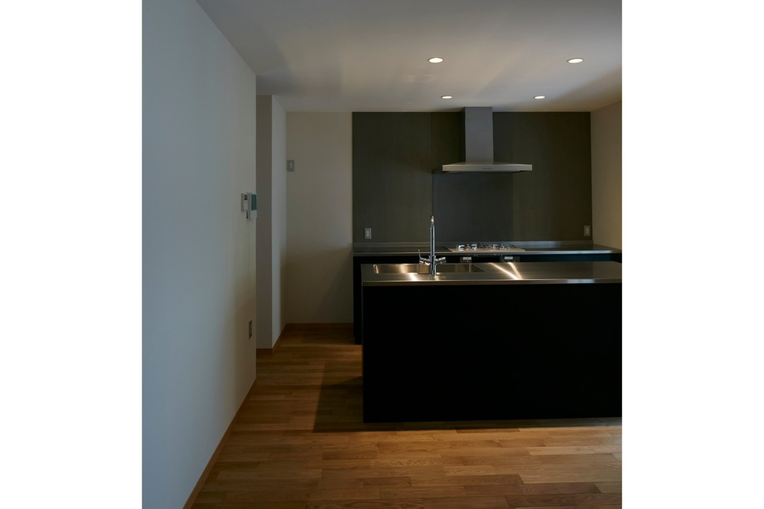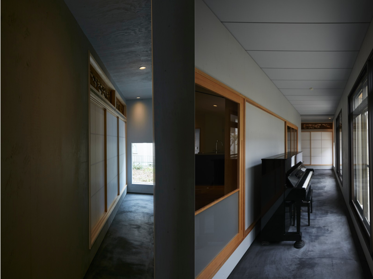 キッチン横の木製ガラス戸を開けると、ドアは完全に隠れ、この通り土間と一体化。キッチン裏の独立した客室となる和室へとつながります。キッチンは作業がしやすいようコンロとシンクに分け、シンク側をアイランドにした造作キッチンです。岐阜の家具職人さんに丁寧に造っていただきました。