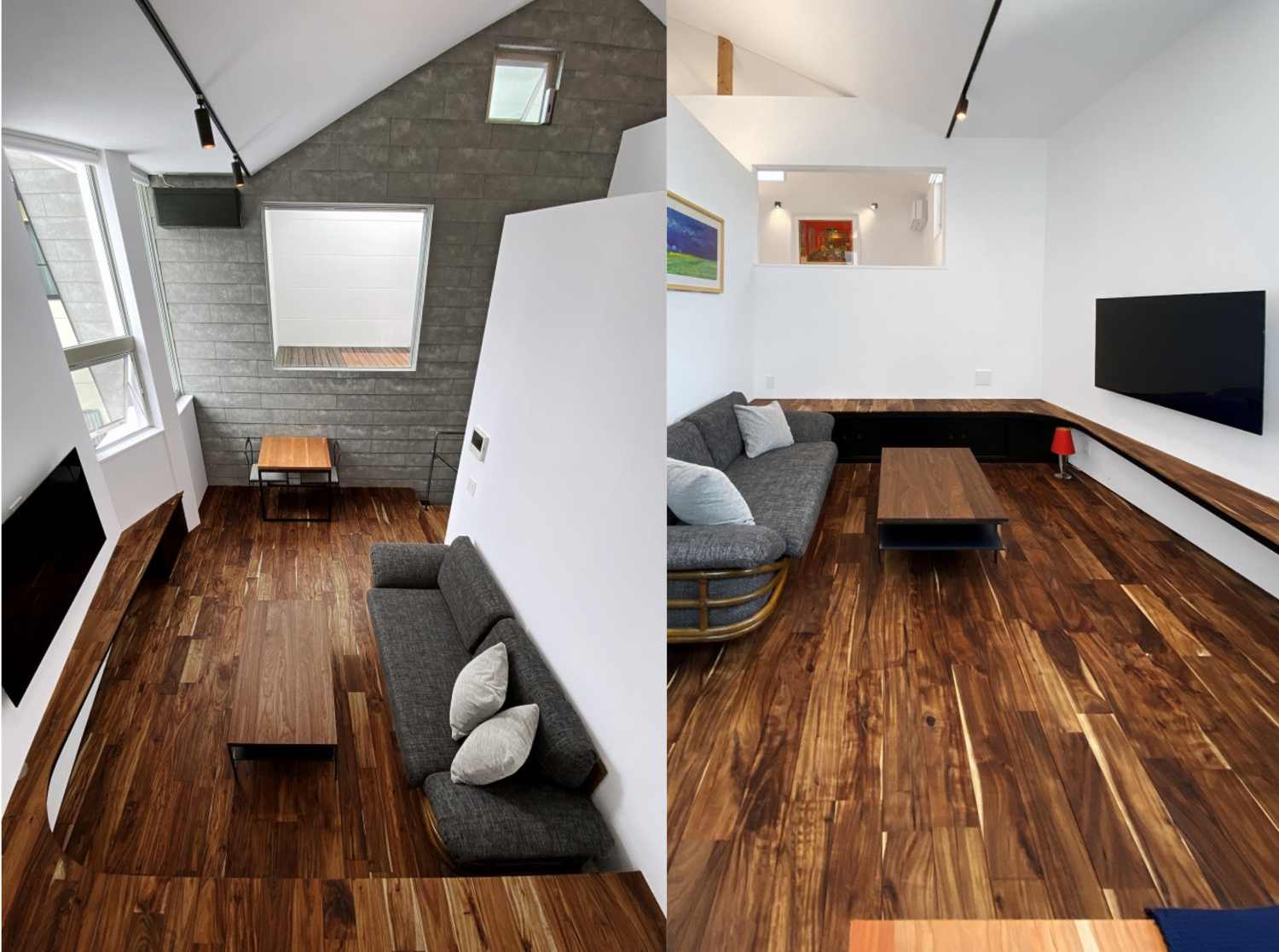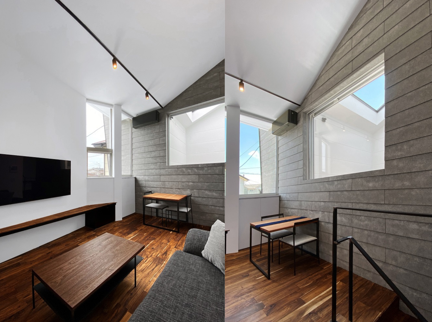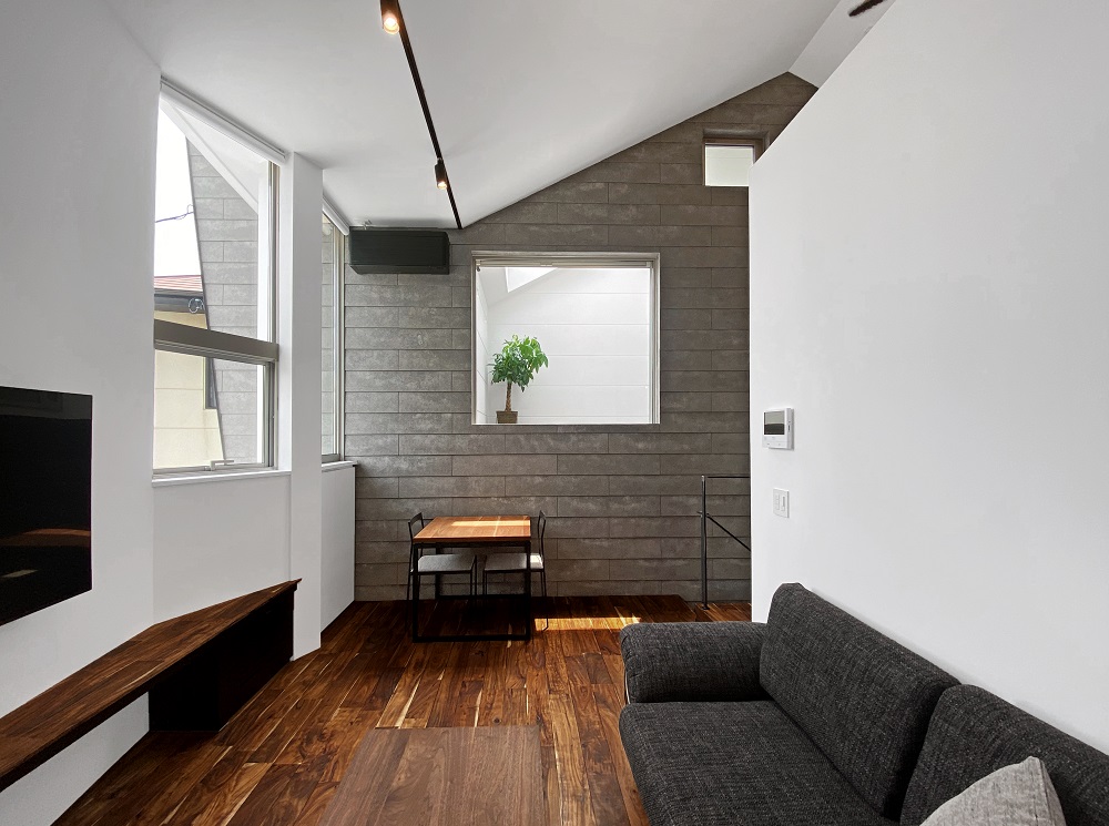 各個室を広くつくる分、リビングを広く取っていません。そのため、設計段階から家具等のサイズに合わせて設計し、空間に無駄が無いようにしています。また、内壁と外壁に同じ素材を採用することで、室内外をつなげるように仕上げ、より広がりを強調しました。