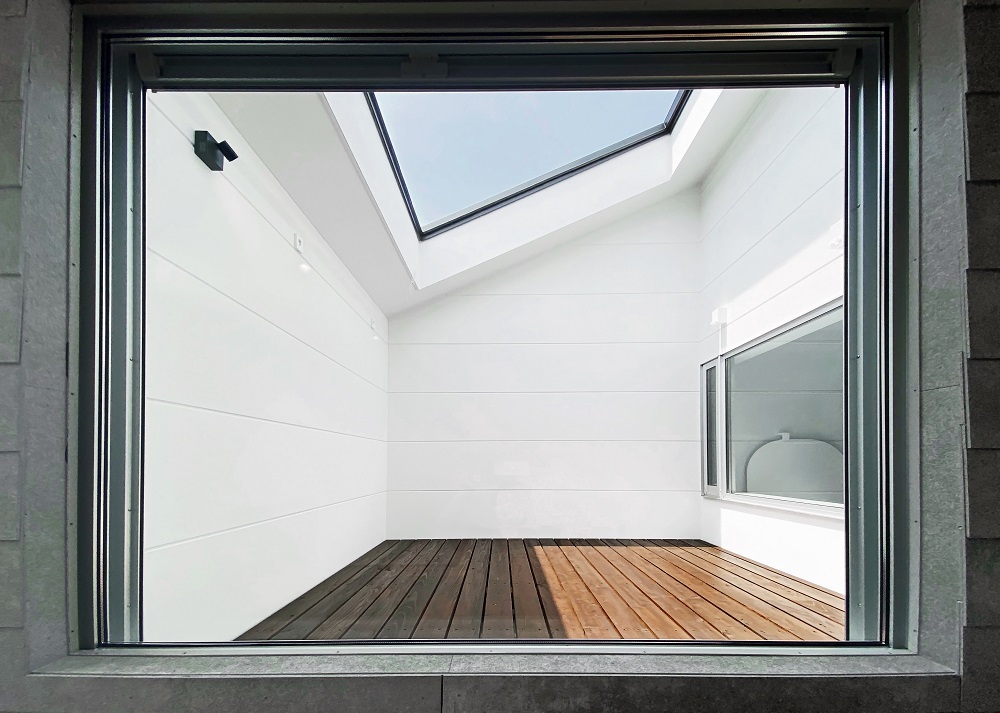 南側にあるルーフテラスからは、隣家のプライベートを確保しながら太陽光が差し込み明るいリビングとなりました。