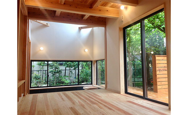通常より低い位置に地窓を設置し、目線をカットしながらも庭の空間やそこで遊ぶ子供たちの気配を室内で感じられるようにしました。明るさも不足しないように、土間部分の吹き抜けに高窓をつけ、隣地の視線のない上部から光を取り込みます。これによって一段下がった土間部分でも室内のフローリング部分でもお隣さんと目が合う心配はありません。