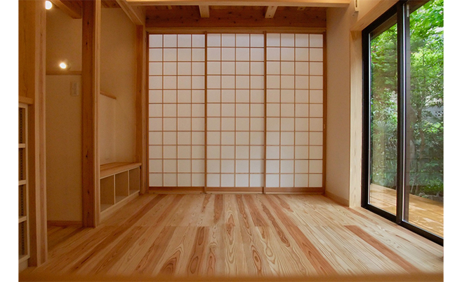 また、土間とリビングのスペースの間に引き込みの障子を設置していて、普段は全開放できますが、夜間や来客時などよりプライベートな空間を作りたいときには、地窓のある土間部分との間を仕切ることができます。このように用途に併せて空間をコントロールできるのもこのプランの工夫の一つです。