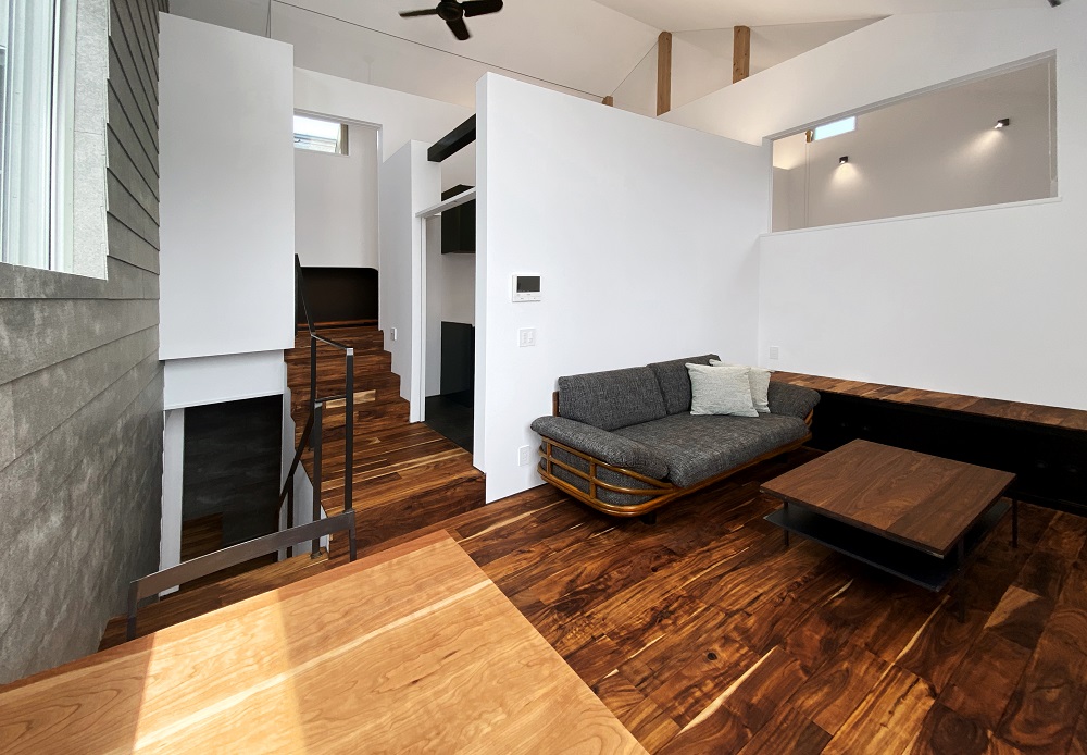 外壁と内壁に同じ材質を採用することで、室内外を繋がるように設計。その流れが意識できる位置に地窓を設けています。