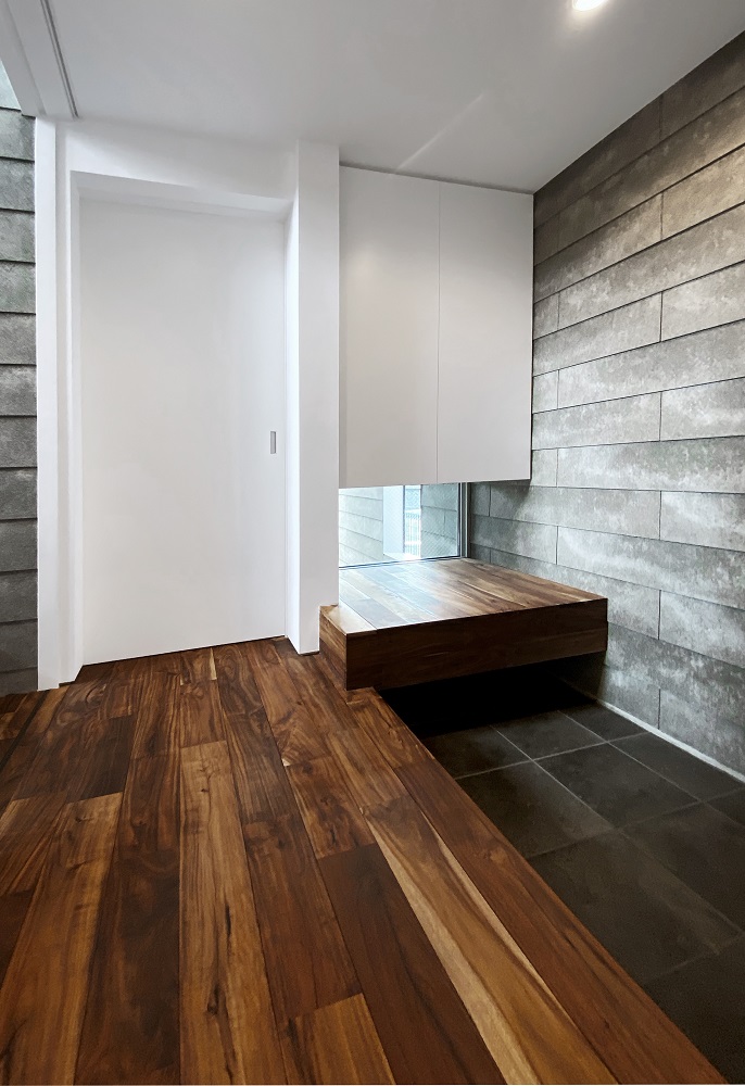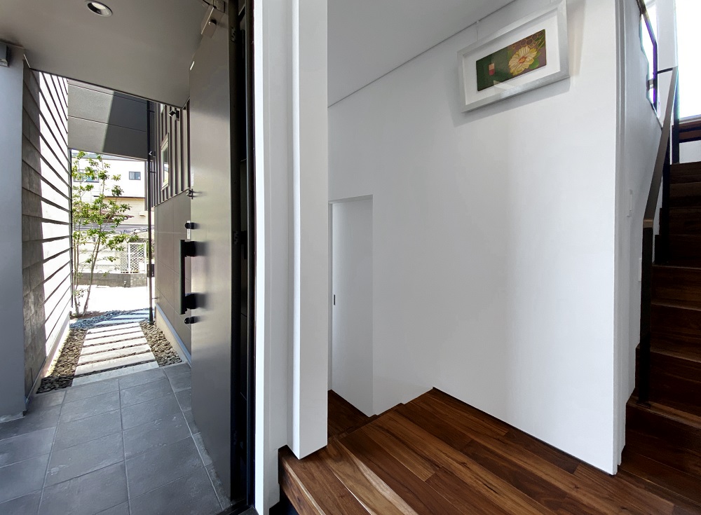 狭小玄関をスペース以上の広がりを感じるよう設計しました。