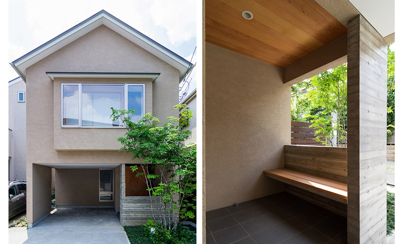 玄関前にも1坪程度の植栽スペースを設け、玄関を優しく目隠ししながら、この緑を回り込むように、ゆったりアプローチします。ポーチにはベンチを作り、一息つける「縁側」のような憩いの場にもなりました。