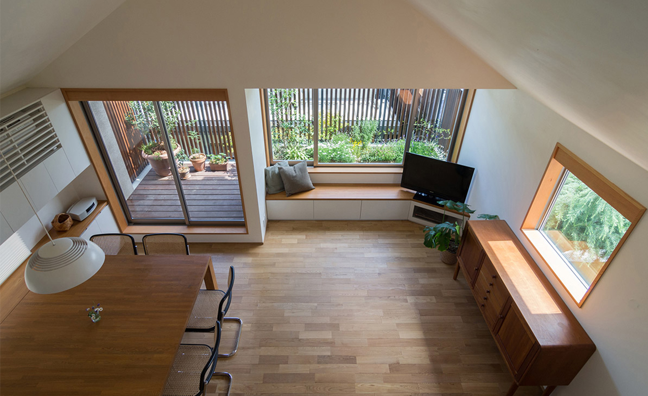 敷地面積が限られていたので、まとまった庭をつくるのではなく、家族の皆さんが家の随所で緑が楽しめる工夫をしました。