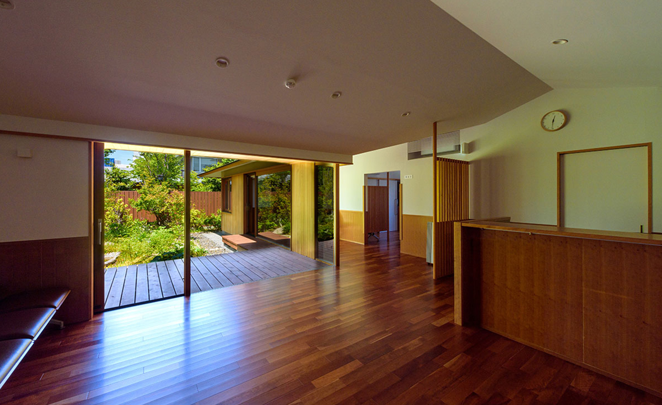 庭を存分に楽しめるよう、開口部を大きくして建物と外を繋げることで、診療所に来た方が待っている間、室内からでも、外の空気に触れながらデッキのベンチからでも緑を眺められるようにしました。外に出て庭の中を散策することもできます。