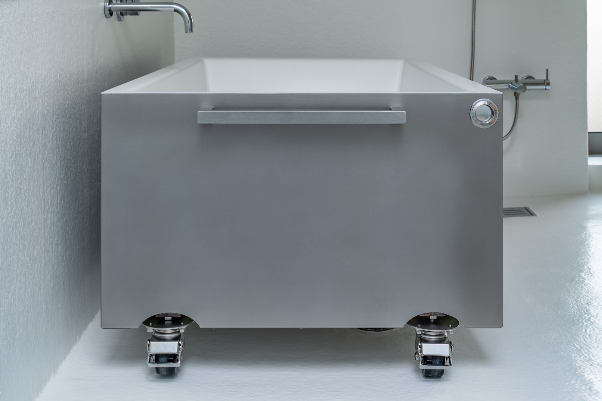 真っ白な空間に存在感のあるステンレスの浴槽は、保温性にとても優れています。特徴的な白い内側は汚れに強く、落ちやすいともされる特殊な白い塗装技術を使ったものです。今回の浴室を設計する際に相談し、キャスターを付けて頂きました。